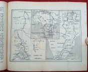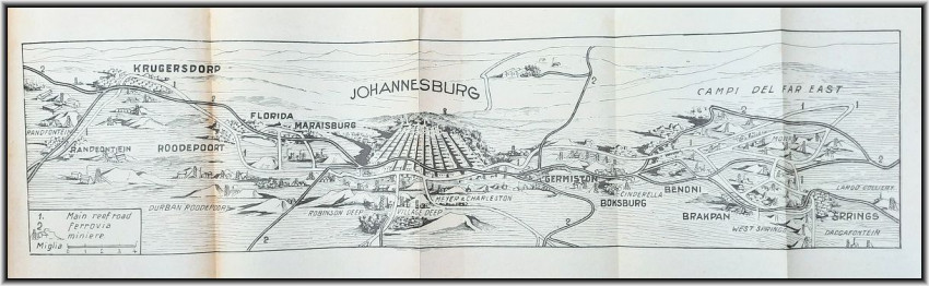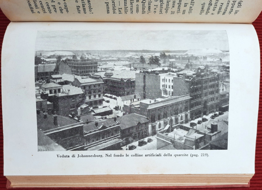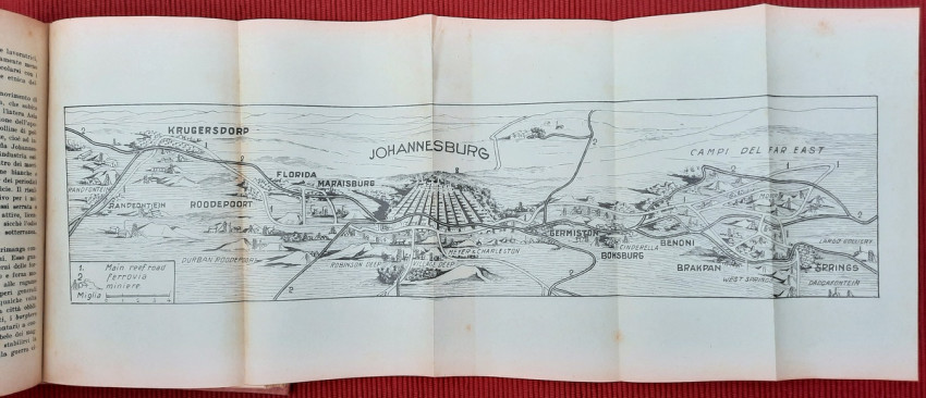 First edition of an interesting work on Africa with 4 folding maps (panoramic 3D map of Johannesburg with main mines, map of Union of South Africa with Cape, map of Orange Free State and map of the whole route of an African journey), single page map of Central East Africa and 32 b&w photographic plates.