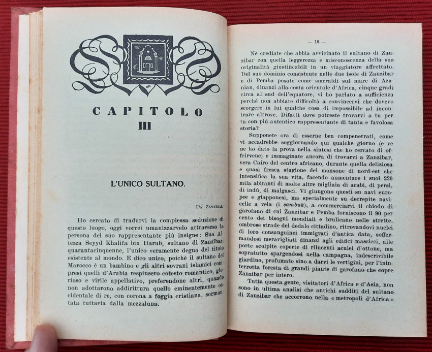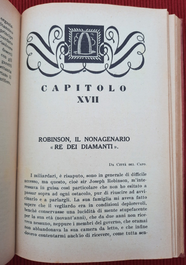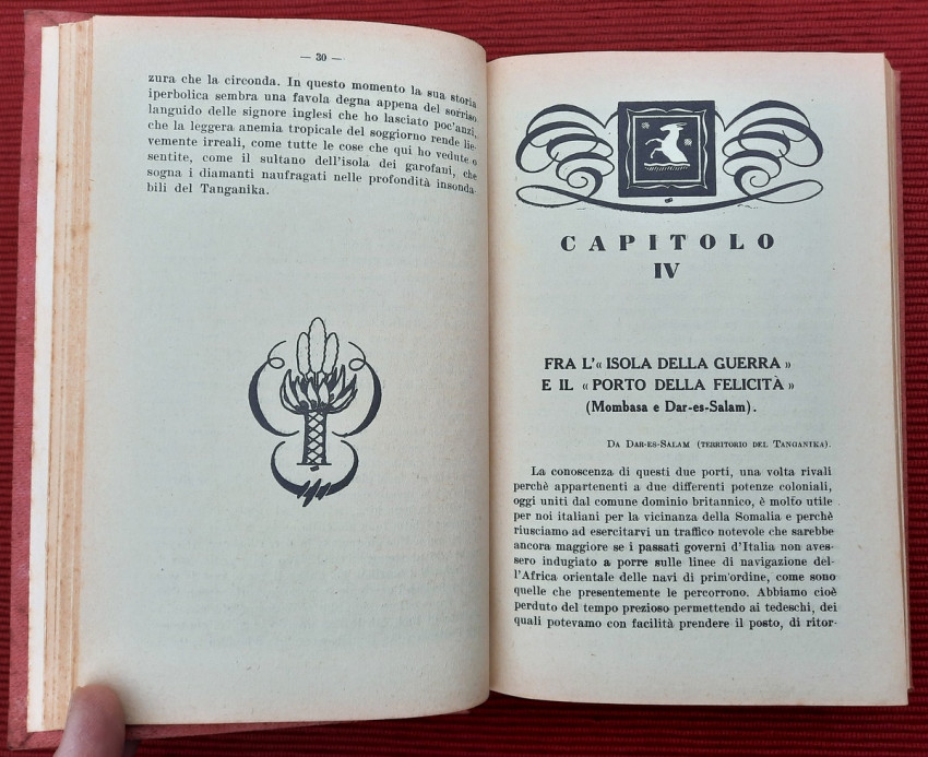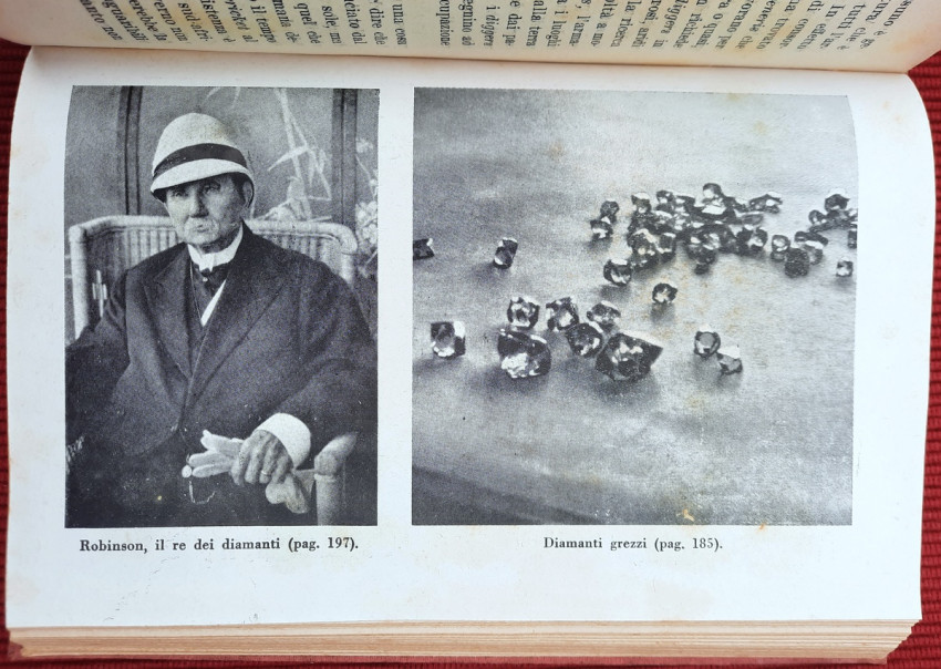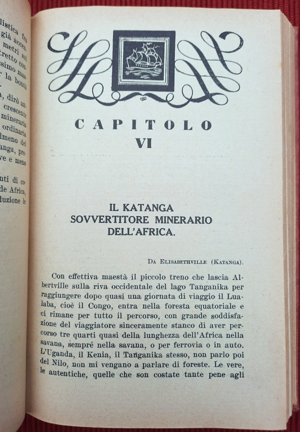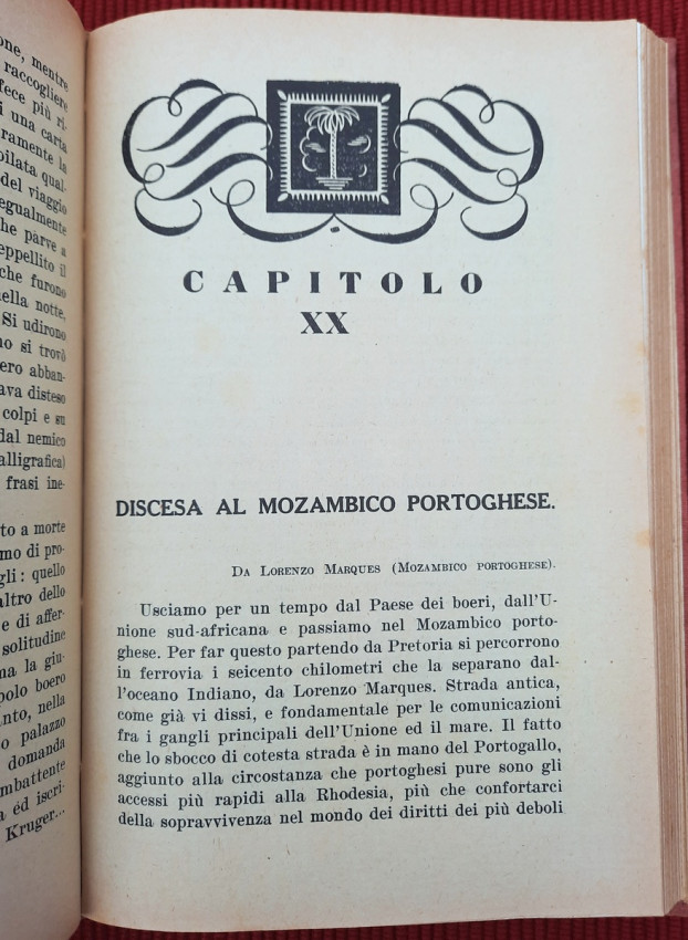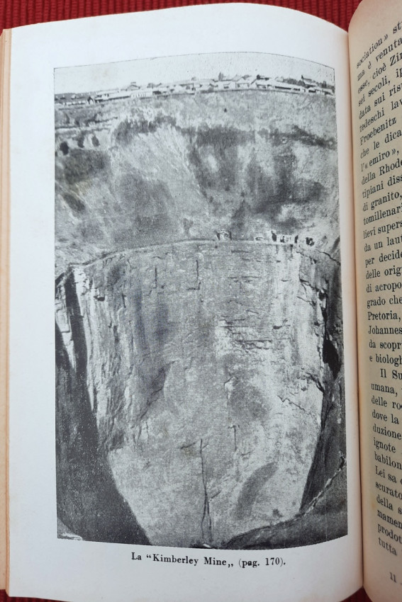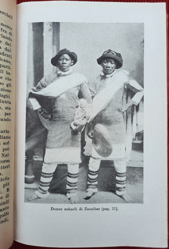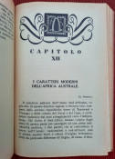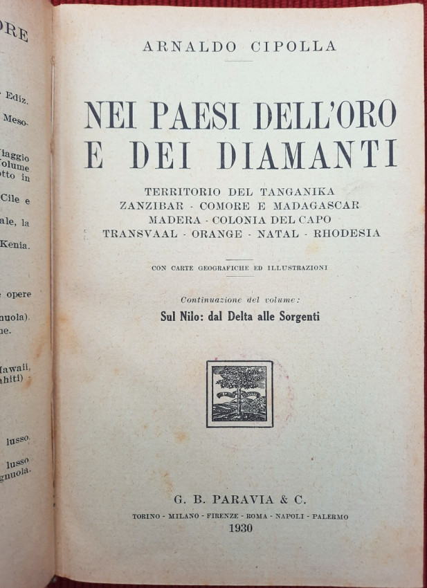 "Nei paesi dell'oro e dei diamanti: Territorio del Tanganika, Zanzibar, Comore e Madagascar, Madera, Colonia del Capo, Transvaal, Orange, Natal, Rhodesia. Con carte geografiche ed illustrazioni. Continuazione del volume: Sul Nilo: dal Delta alle Sorgenti."; Text in Italian; Collation complete - Title page, [1], 351 pages, with 5 maps and 32 b&w photographic plates; Binding is tight, firm and strong, little bumped and faded (more to the spine and extremities). Joints and hinges are whole, strong and secure. Text block/pages in very good condition, clean and very bright with some yellowing, no marks throughout, with very occasionally light foxing dots. Title page with a slight age tanning. A sound copy of this scarce title.