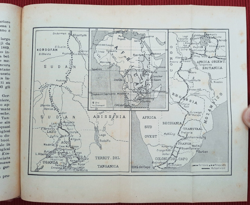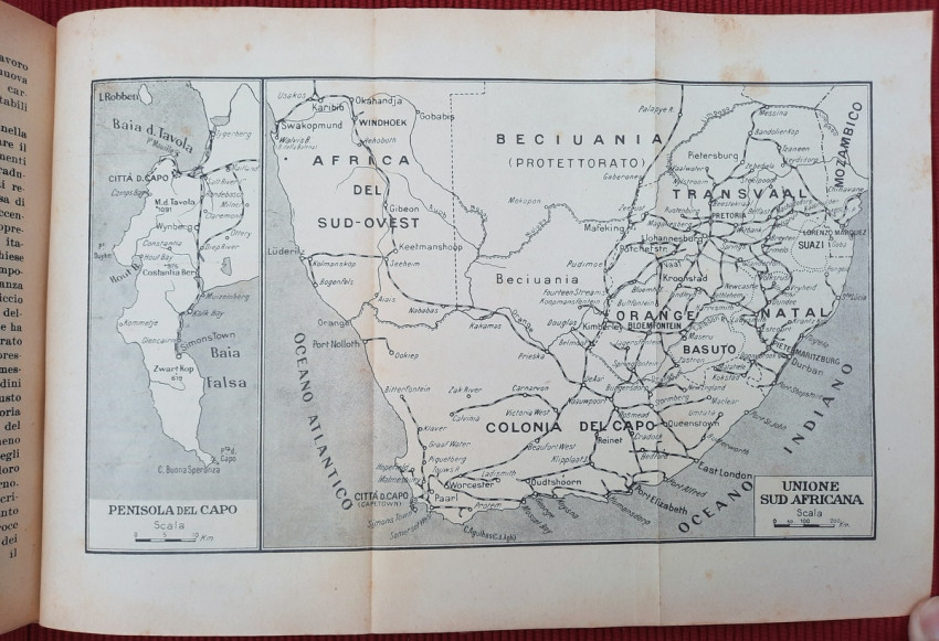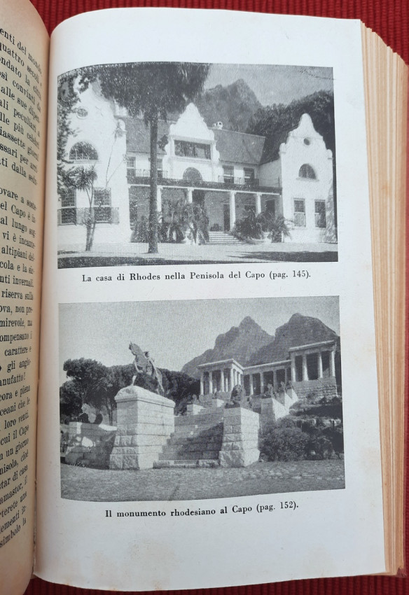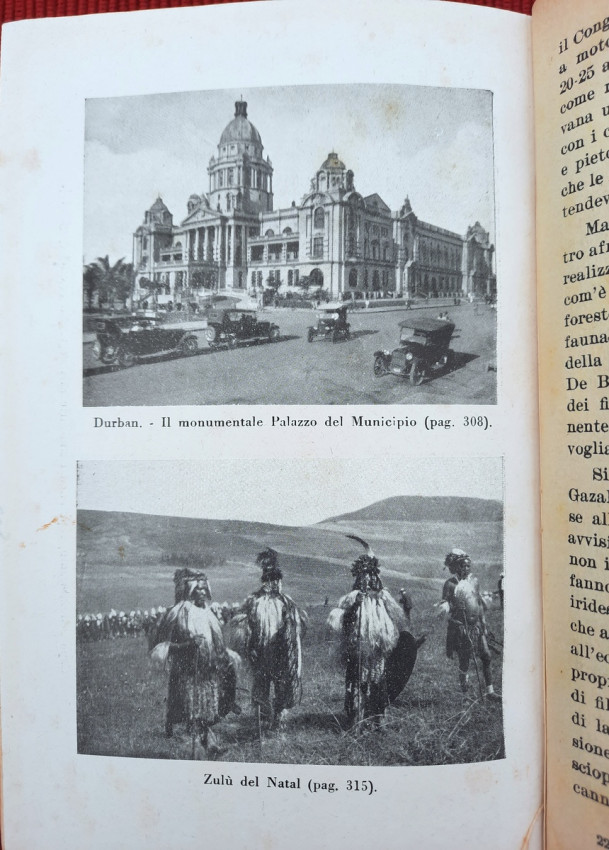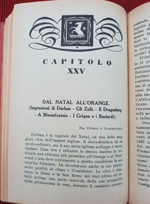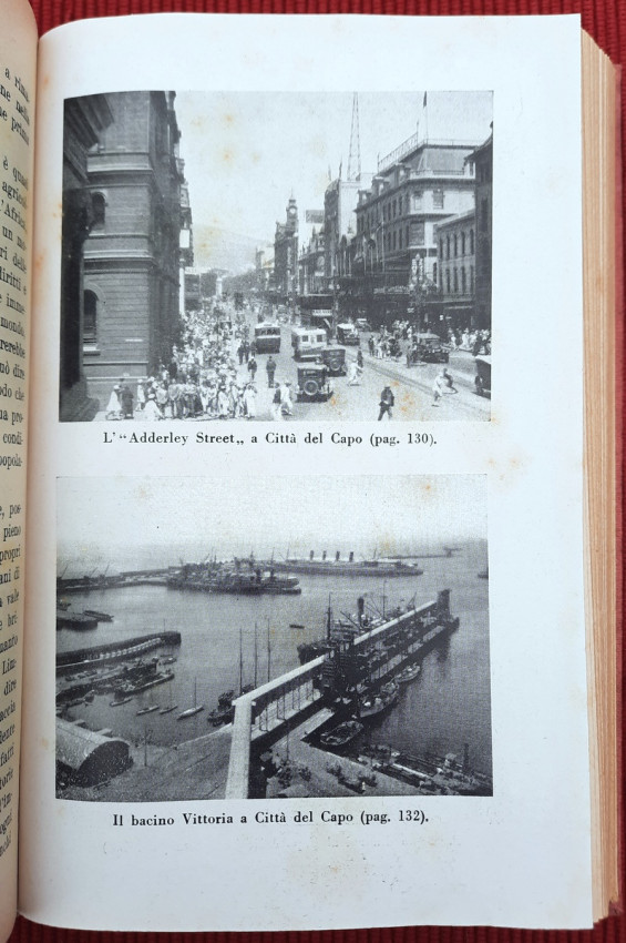 Topics covered include the slopes of Kilimanjaro, Zanzibar, Mombasa and Dar es Salaam, Tanganyika, Katanga, Comoros, Madagascar, Italian Jubaland and Sudan, Madeira, South Africa, Southern Africa, Rhodesia, Johannesburg, Pretoria, Portuguese Mozambique, Rhodes and Zimbabwe, Victoria Falls in the Zambezi, Port Elizabeth, Natal, Oranjestad, Durban, Dragenberg, Bloemfontein, Griqua, Southwest Africa, etc. Continuation of Cipolla's work "On the Nile: From the Delta to the Sources".