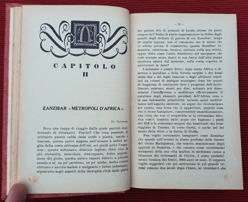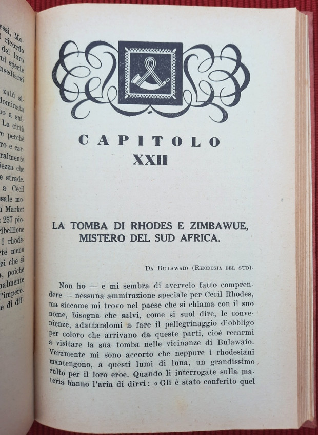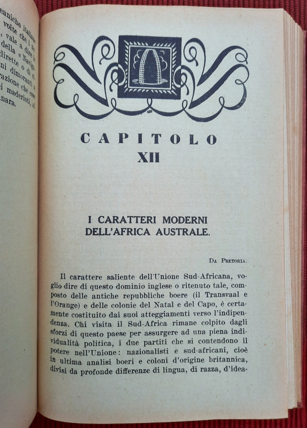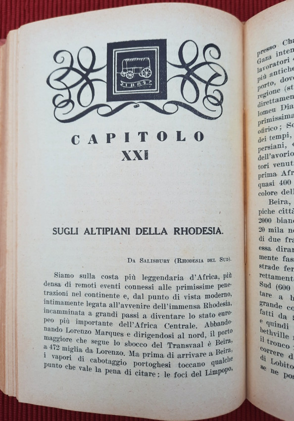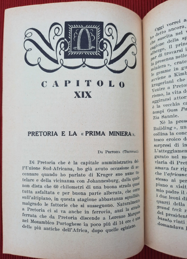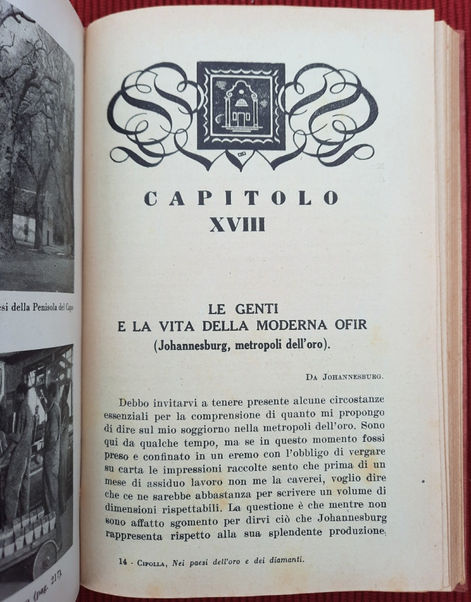Topics covered include the slopes of Kilimanjaro, Zanzibar, Mombasa and Dar es Salaam, Tanganyika, Katanga, Comoros, Madagascar, Italian Jubaland and Sudan, Madeira, South Africa, Southern Africa, Rhodesia, Johannesburg, Pretoria, Portuguese Mozambique, Rhodes and Zimbabwe, Victoria Falls in the Zambezi, Port Elizabeth, Natal, Oranjestad, Durban, Dragenberg, Bloemfontein, Griqua, Southwest Africa, etc. Continuation of Cipolla's work "On the Nile: From the Delta to the Sources".