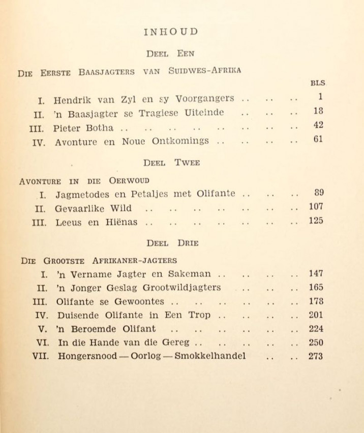 The author initially started writing a history of the pioneer Afrikaners in West and South West Africa but soon realised that he could write a whole book dedicated to the hunting adventures of the old Thirst Land Trekkers. The three personalities who feature prominently in this book were the career hunters Pieter Botha, Jan Labuschagne, and Daan Robbertse.