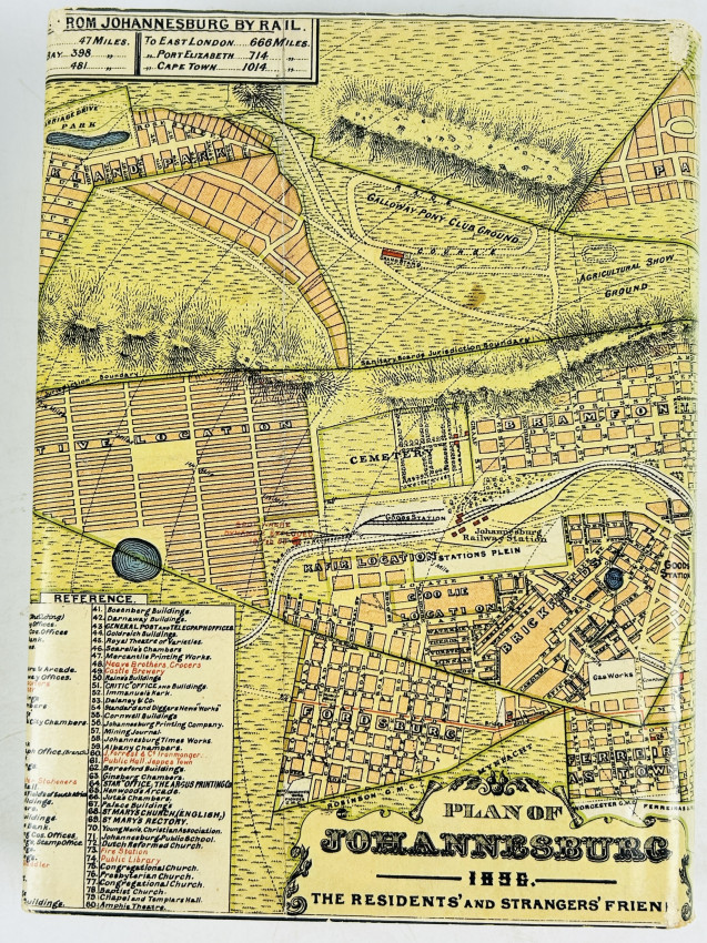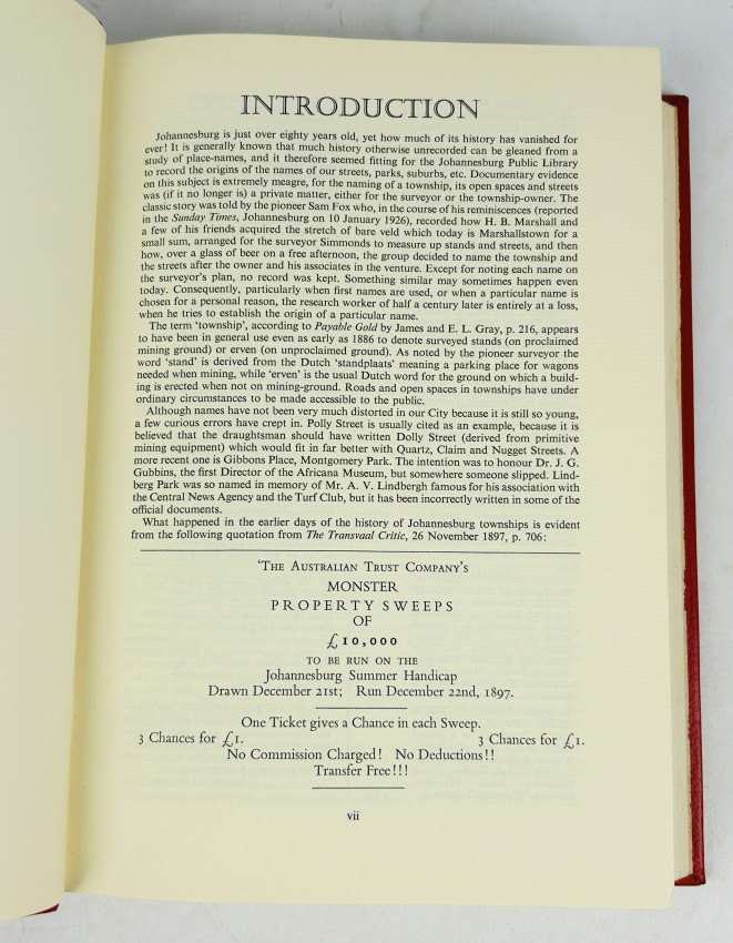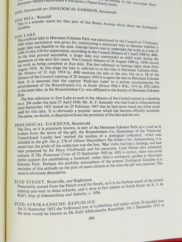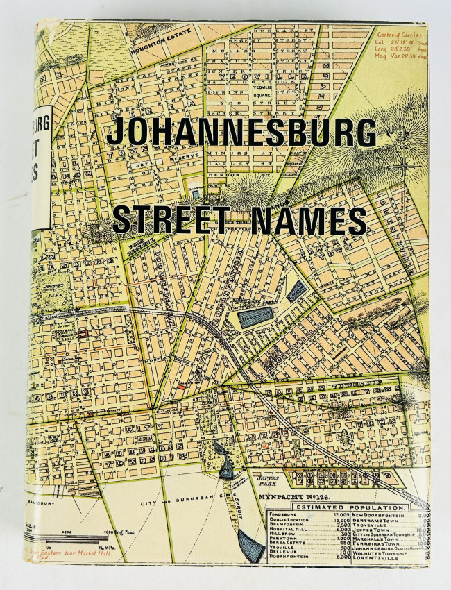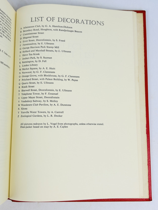 A comprehensive study on the origins of Johannesburg place-names up to the end of 1968 as found in streets, suburbs, parks and other public places. The alphabetic lists includes references to sources and an appendix is included which lists selections under such headings as animals, Johannesburg, worthies, rivers and places. Each letter of the alphabet has a page dedicated to it with an accompanying decoration which has been redrawn by L Vogel from photographs. The dust jacket is based on a map by AE Caplen.