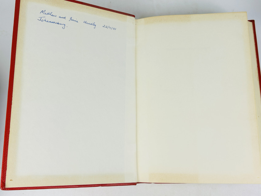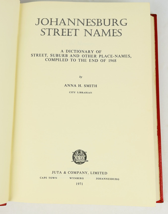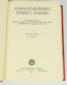This copy off Johannesburg Street Names is one of the scarce editions bound in red leather / leatherette. It has gilt titling to the front cover and on the spine. The spine titling gilt is lightly faded.