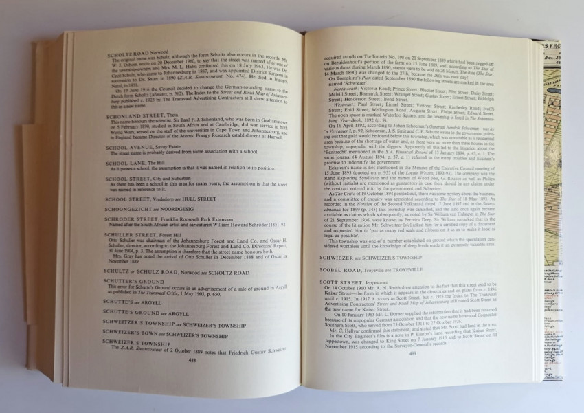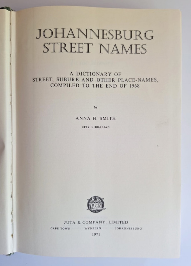 Compiled by the then librarian of Johannesburg City Library, it is an invaluable source book and reference guide to street and suburban names in the city. Listings are alphabetical and an appendix includes lists under subject headings.