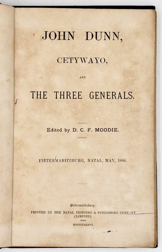 Mendelssohn (Sidney) South African Bibliography vol 1 pages 494-5. 'The history of John Dunn, the white Chief, is one of the most extraordinary narratives in South African annals. He started for the country in 1853, and traded and hunted till 1856, when the war of succession broke out between the two sons of Mpanda, i.e. Cetewayo and Umbulazi. Dunn joined the forces of the latter prince, who was defeated and slain, but he was afterwards reconciled to Cetywayo, and was successful in recovering the cattle of the white traders in Zululand. Some time after, the successful heir to the throne asked him to settle in Zululand, "as he wanted a white man as a friend to live near him and advise him," and after some consideration he accepted this offer. Panda dying in 1872, Cetewayo succeeded him, and there is a description of the scenes of his coronation, at which Mr Shepstone represented the English nation at the King's desire; amongst those present being Mr. Baines, the celebrated traveller.