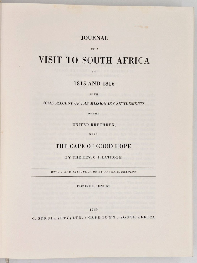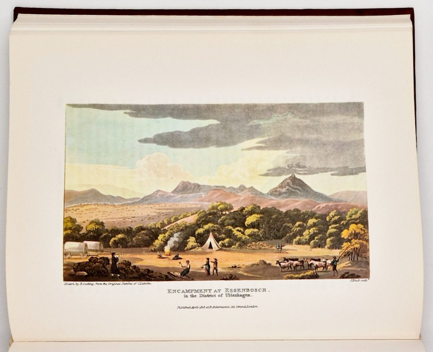 Bradlow (Frank R.) in the introduction comments about the plates, ‘In view of the fact that all twelve of the coloured aquatint engravings, whether by Melville or Latrobe, would appear to have been redrawn by R. Cocking, it is of interest that the only merit Latrobe claims for the sketches is that they are 'scrupulously exact in outline'. This accuracy is almost certainly due to the fact that Latrobe used a portable camera obscura to capture the outlines. He twice refers to this camera obscura, once on page 73, when he relates how, when it was standing “in a position which showed the church and the grove, with people passing and repassing”, the Genadendal Hottentots were “exceedingly amused and astonished”. These twelve aquatints are in three tints, grey, black and brown, with hand water-colouring. They are extremely competent in composition, technique, and colouring, and in the writer's opinion, are superior to most illustrations in other contemporary books of South African travel.’