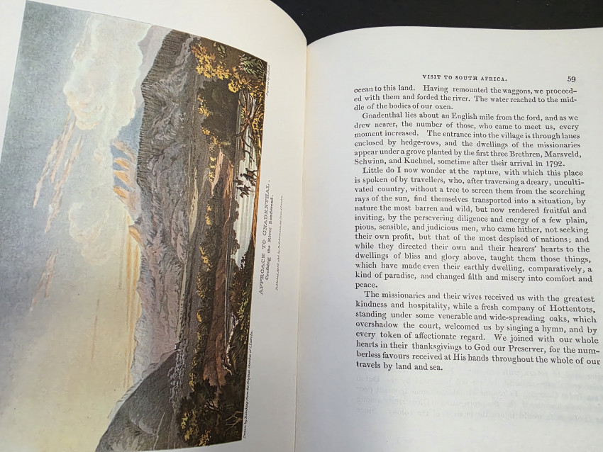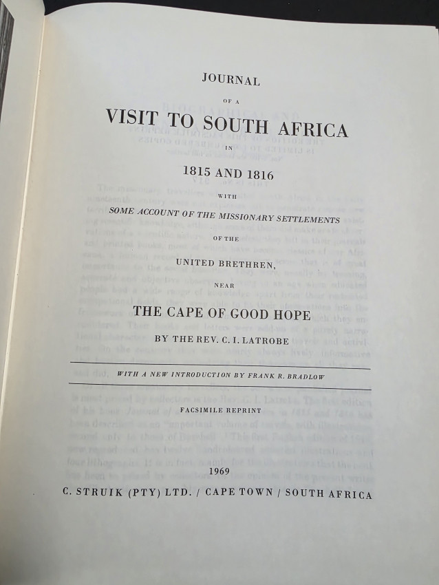 Facsimile reprint of the 1818 edition published by Seeley of London. Limited to 1000 numbered copies of which this is no. 917. With a new introduction by South African historian Frank R. Bradlow. 406 pp. Folio. Fold-out map of Cape of Good Hope Colony. Frontispiece- engraved portrait of author, 16 plates (mostly colour landscapes). Brown cloth boards with gilt edging to front and back boards. Gilt decorative panelling and lettering on spine.