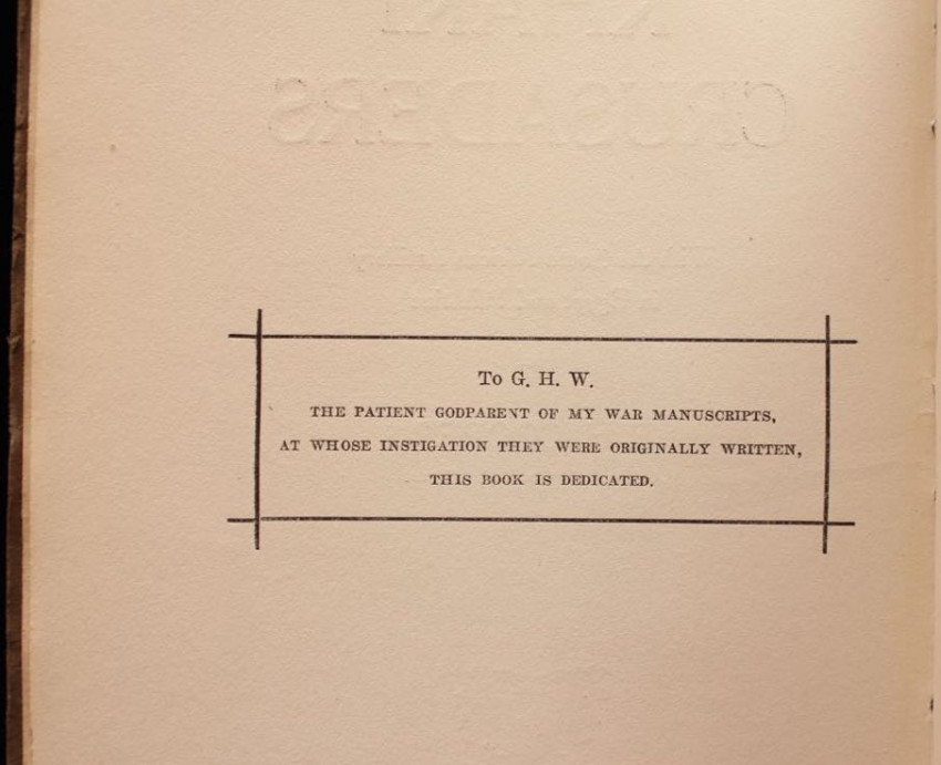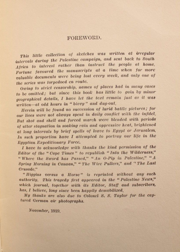 'This little collection of sketches was written at irregular intervals during the Palestine campaign, and sent back to South Africa to interest rather than instruct the people at home. Fortune favoured the manuscripts at a time when far more valuable documents were being lost every week, and only one of the series was torpedoed en route.'