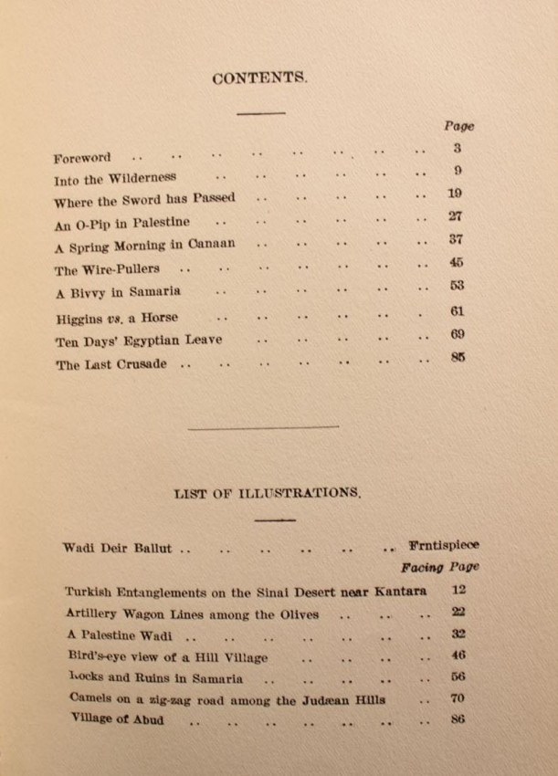 'Herein will be found no succession of lurid battle pictures; for our lives were not always spent in daily conflict with the infidel. But shot and shell and forced march were blended with periods of utter stagnation in soaking rain and oppressive heat, brightened at long intervals by briefs spells of leave to Egypt or Jerusalem. In such proportion have I attempted to portray our life in the Egyptian Expeditionary Force.' - author's foreword