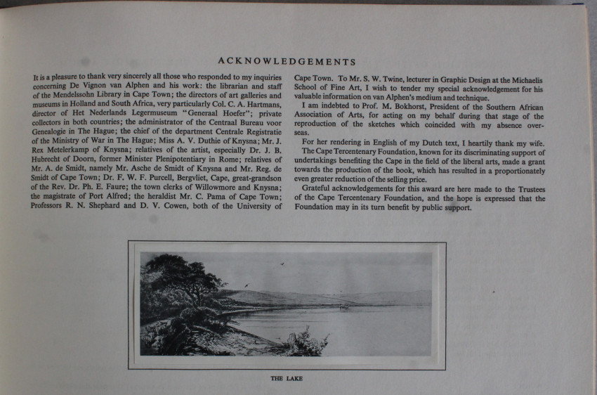 De Vignon van Alphen's Knysna sketches represent a unique contribution to middle 19th century art in South Africa, yet they are hardly known today. De Vignon van Alphen was a srong individualist and since he was a late follower of the Romantic School, his sketches with their poetic, even mystical appeal, differ fundamentally from the work of all his South African contemporaries.