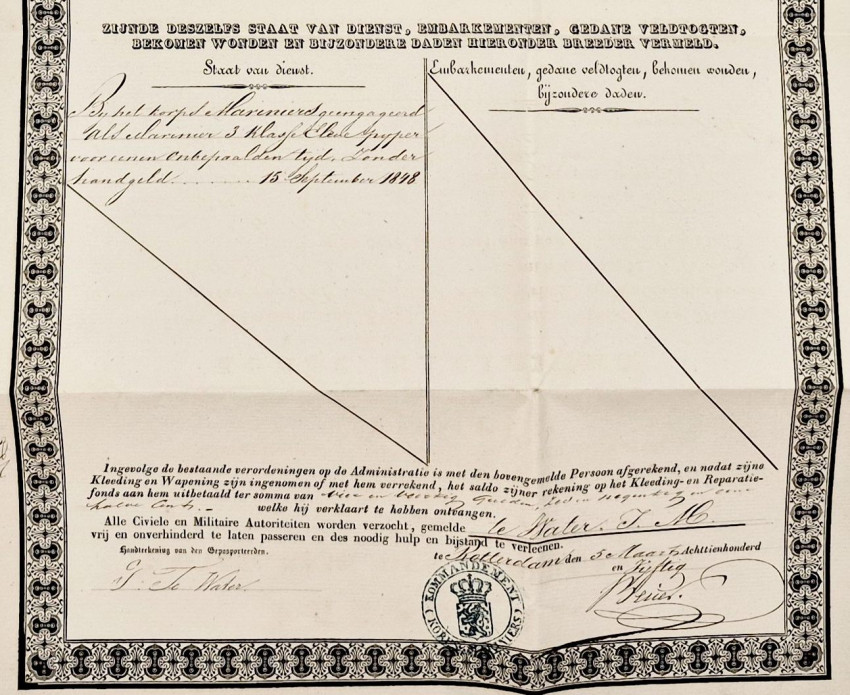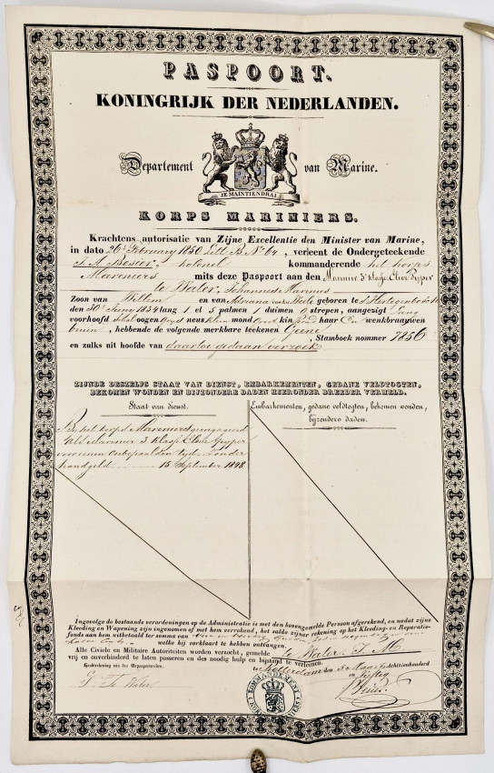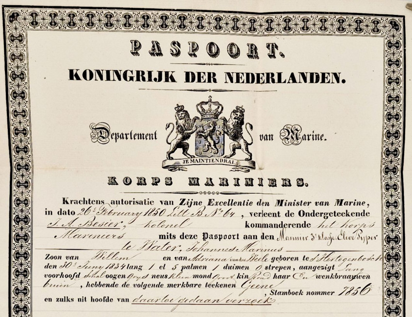 Krachtens autorisatie van Zijne Excellentie den Minister van Marine, in dato 26 February 1850 Litt. B. N°. 64, verleent de Ondergeteekende J.A. Bosier, kolonel kommanderende het korps Mariniers, mits deze Paspoort aan den Marinier 3e klasse Clee Pyper