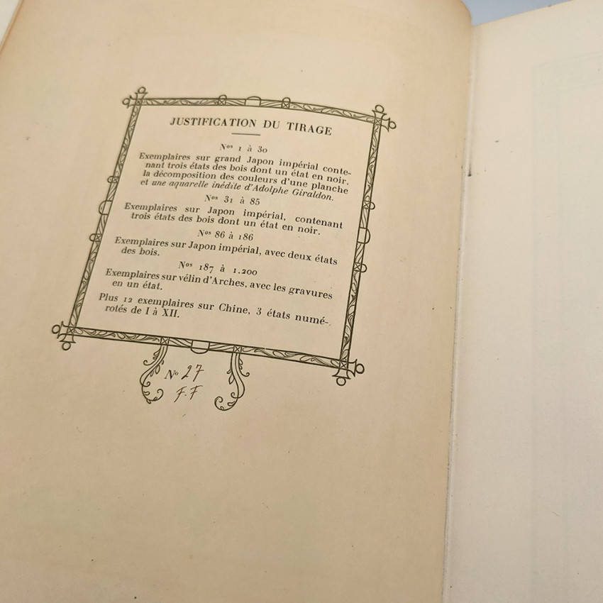Containing 32 watercolors by Adolphe Giraldon engraved on wood in color by Ernest Florian. This very complete book is composed of a frontispiece and 7 chapters each comprising 1 illustrated title page, 1 header and 1 tailpiece. The 2 states in color are bound in the text.