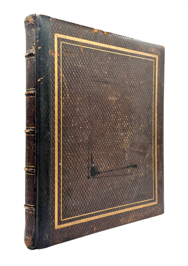Album, folio (445 x 380 mm), containing 29 stiff card leave with 91 Woodburytype images laid onto the card leaves which are bound in on linen hinges - two leaves are loose, original brown diced Russia leather with gilt rules, rebacked preserving the backstrip, there is no titling, all edges gilt, patterned endpapers, hinges strengthened with black leather, the card leaves are foxed throughout but the Woodburytype prints are unaffected.