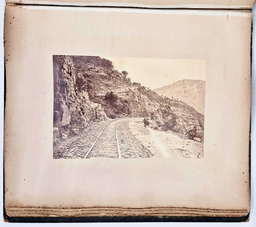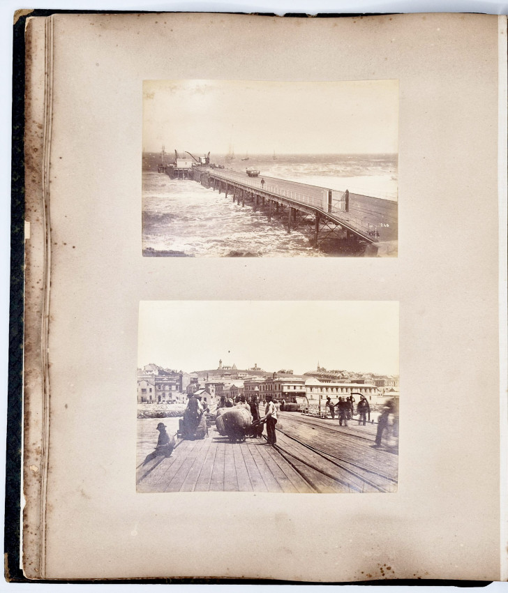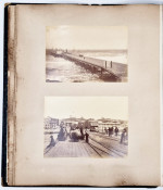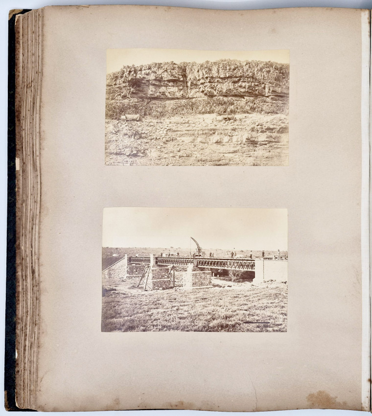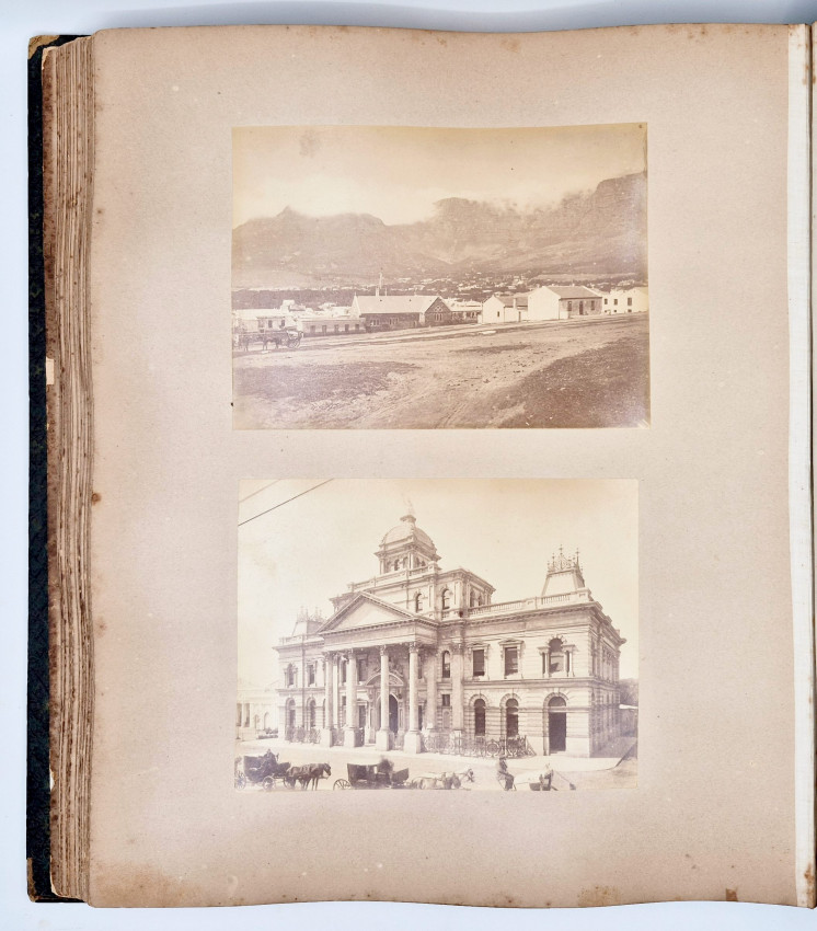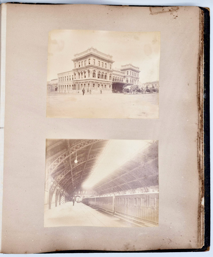 There are 19 full-plate photographs - 262 x 342 mm - mostly of railway subjects, the remainder are half-plate mounted two per leaf of towns, rural scenes, harbours and ships and ship wrecks, African villages and life - one showing African workers carrying elephant tusks on a beach, and other views.
