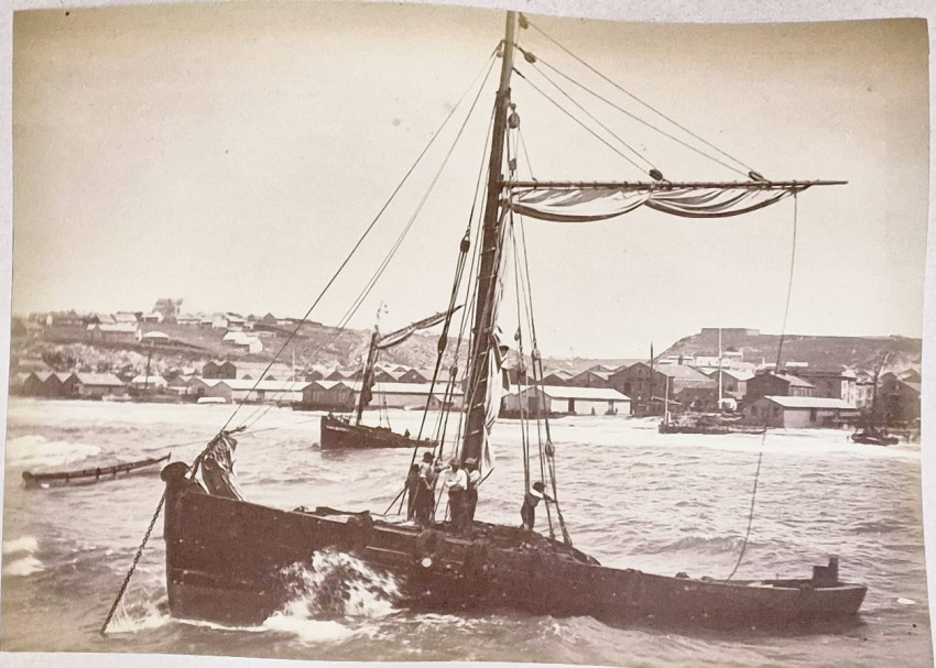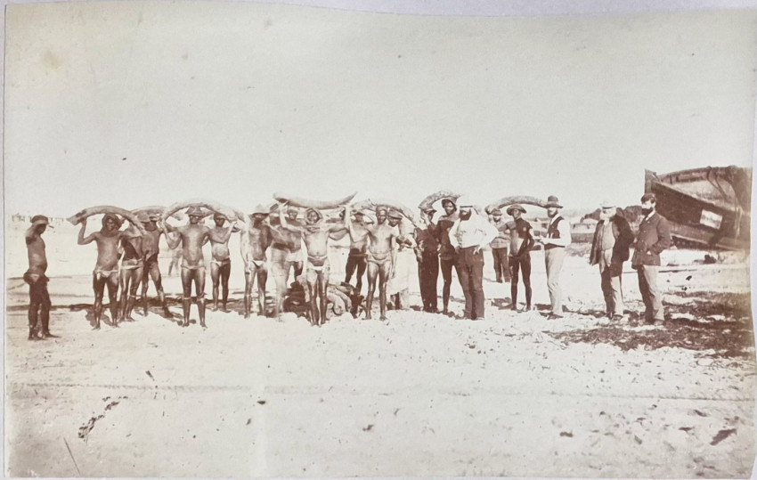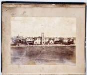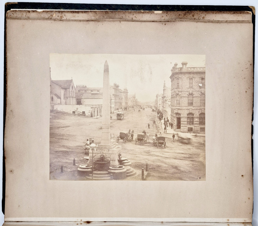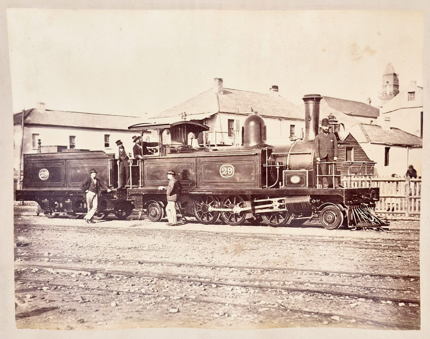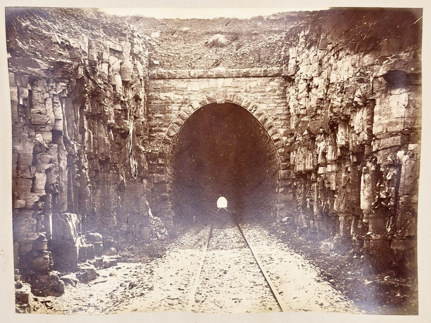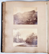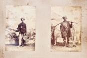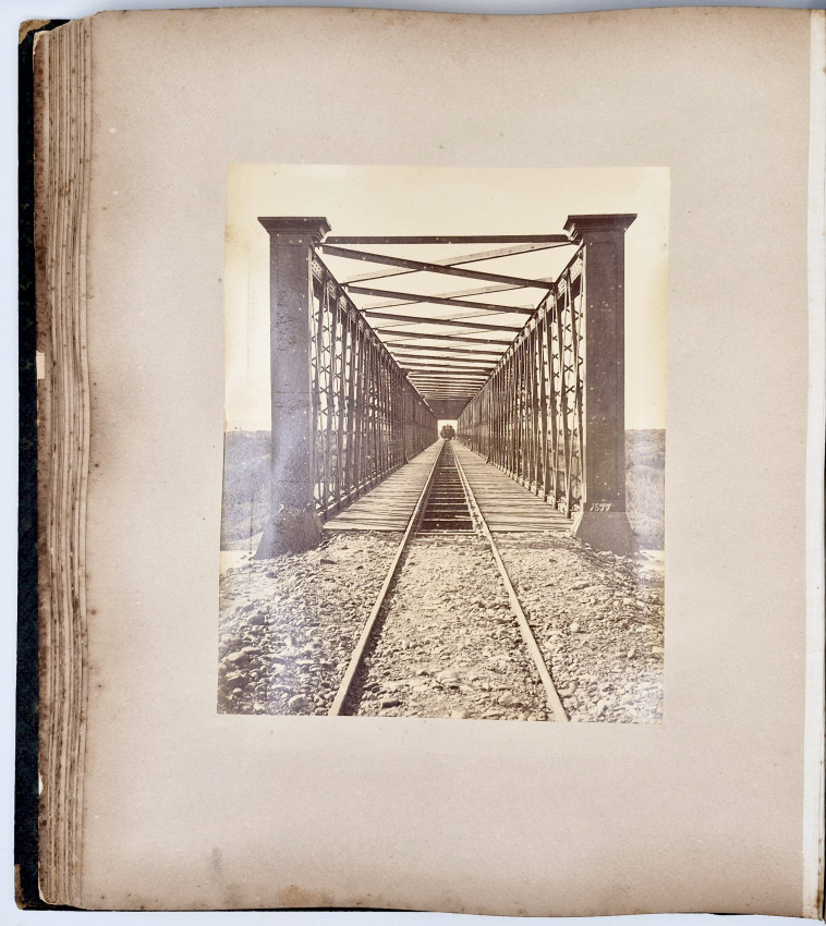 There are 19 full-plate photographs - 262 x 342 mm - mostly of railway subjects, the remainder are half-plate mounted two per leaf of towns, rural scenes, harbours and ships and ship wrecks, African villages and life - one showing African workers carrying elephant tusks on a beach, and other views.