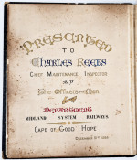 A hand lettered presentation page in gilt, red and blue reads: Presented to Charles Reeks, Chief Maintenance Inspector by The Officers and Men of the Department Midland System Railways, Cape of Good Hope, December 31st, 1884.