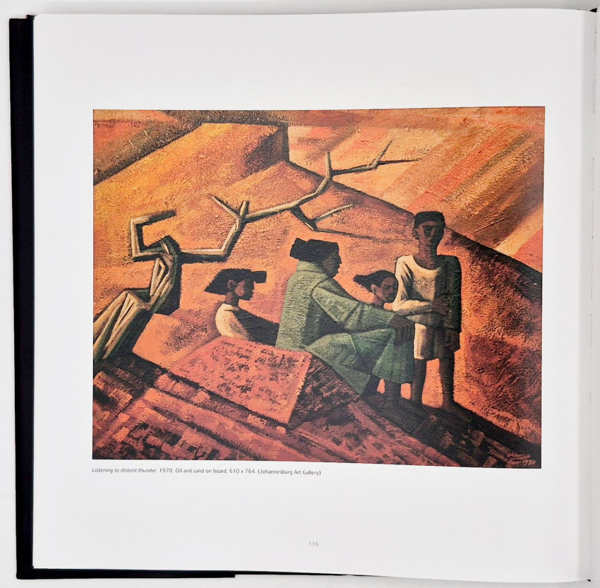The phrase "Listening to Distant Thunder" is the title of a specific 1970 painting by Clarke (page 116). It depicts a woman and children in a landscape that feels heavy with an approaching storm — a metaphor for the contemporary political tensions in South African society.