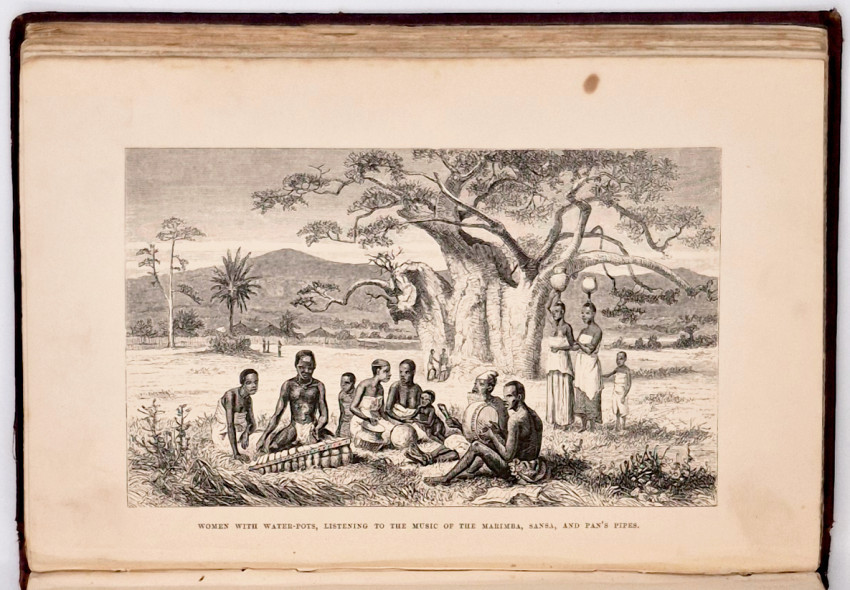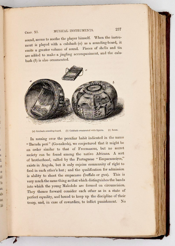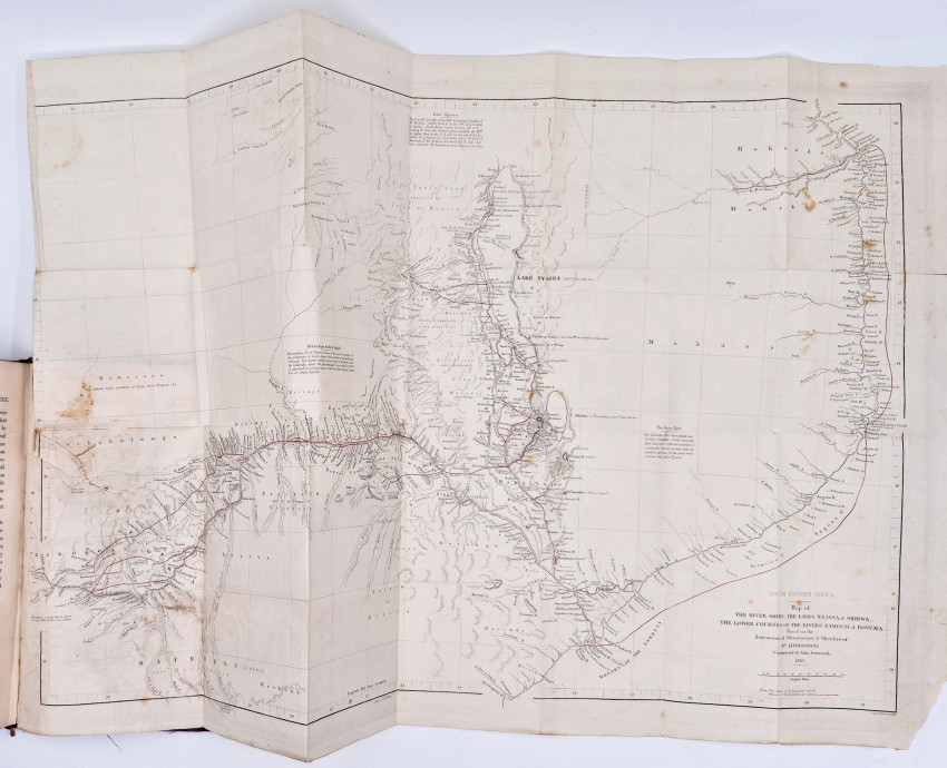 First edition: 608 pages, wood engraved folding frontispiece - A Bird's Eye View of the Great Cataracts of the Zambezi (called Mosioatunya, or Victoria Falls) - tears at the fore edge and the first fold, title page vignette, 12 plates and numerous illustrations, large folding map with the expedition's route coloured in red - foxed, frayed at the fore edge and torn at the hinge which has been simply repaired, uncut fore edge and bottom edge, original maroon cloth with gilt vignette of slaves on the upper cover - spine worn and frayed, titled gilt on the spine, original black endpapers intact with the binder's ticket of Edmonds & Remnants on the rear paste-down endpaper, with the bookplate of W.H. Smith & Sons, Subscription Library, 186 Strand, London on the front paste-down endpaper and another bookplate on the free endpaper, a good ex-lending library copy.