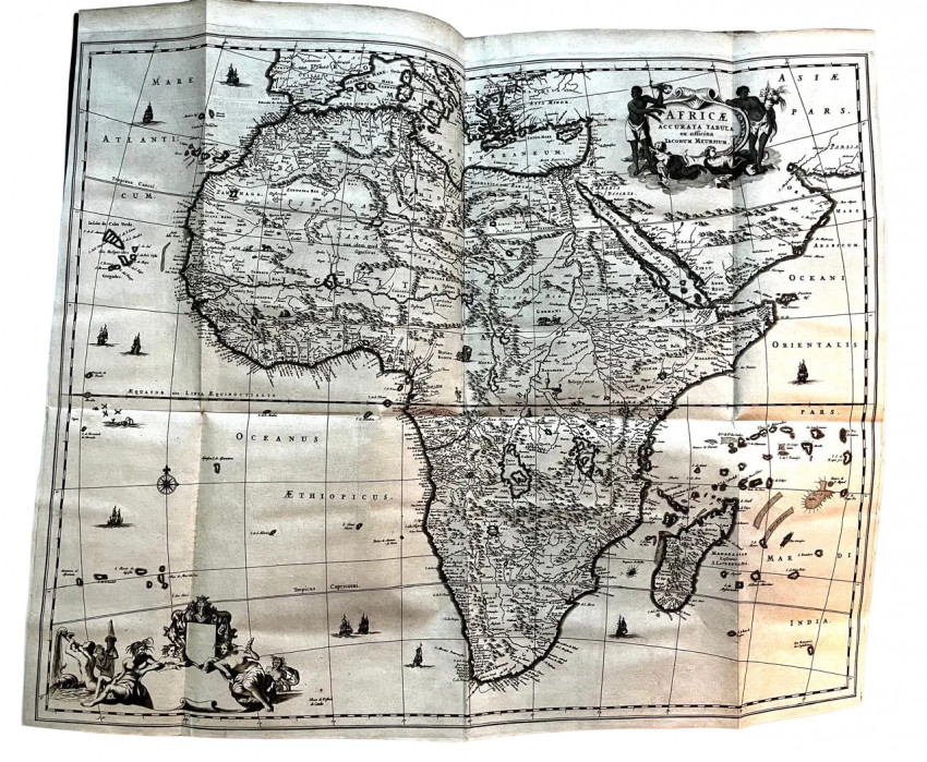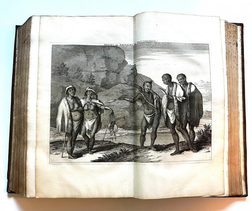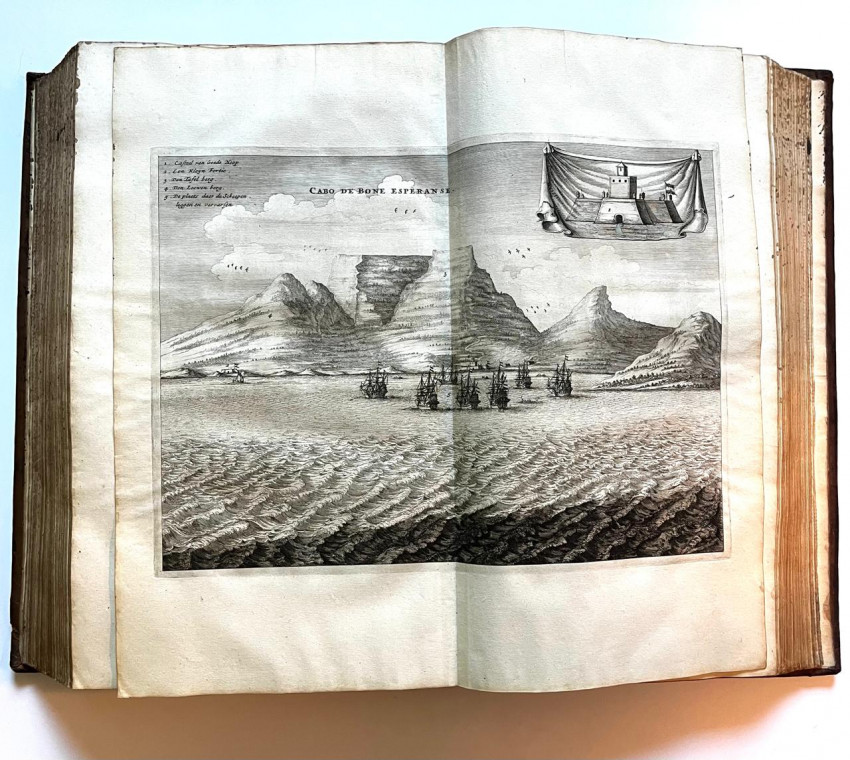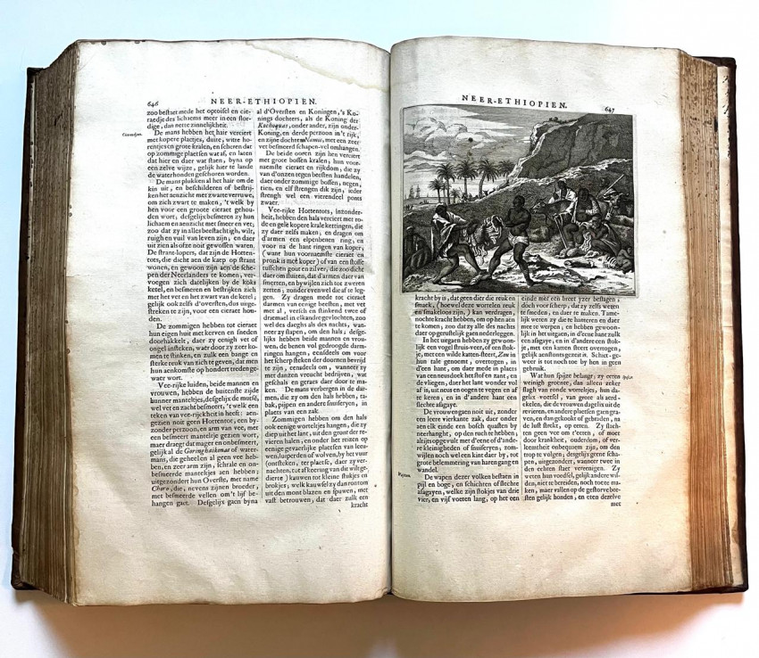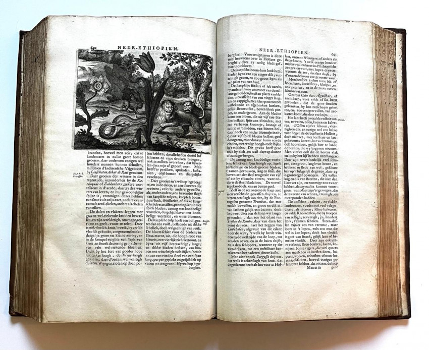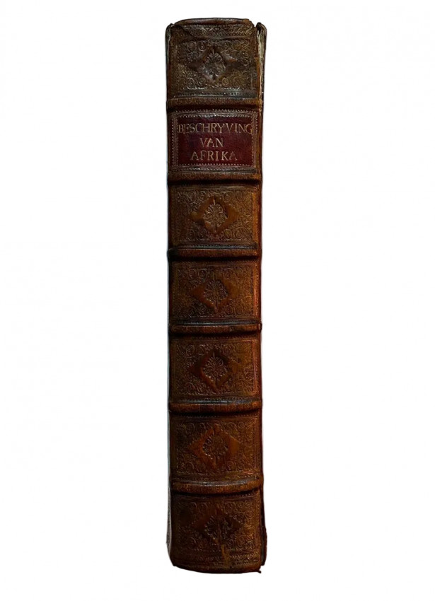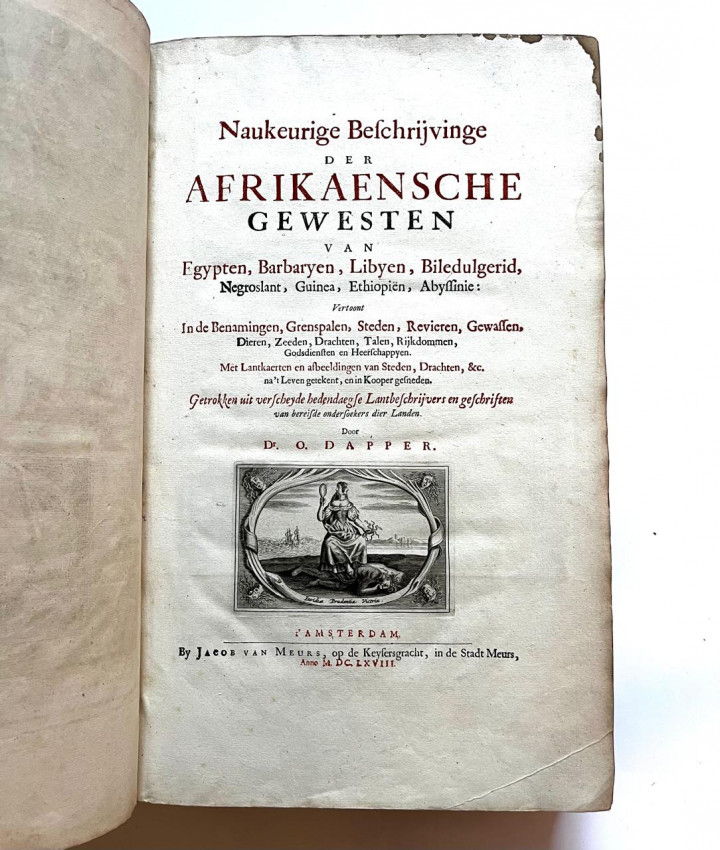 Including "Naukeerige beschrijvinge der Afrikaensche eylande, d'eilanden van Kanarien, Kaap de Verd, Malta en andere...", two pages of which are torn through, damaging an in-text illustration.