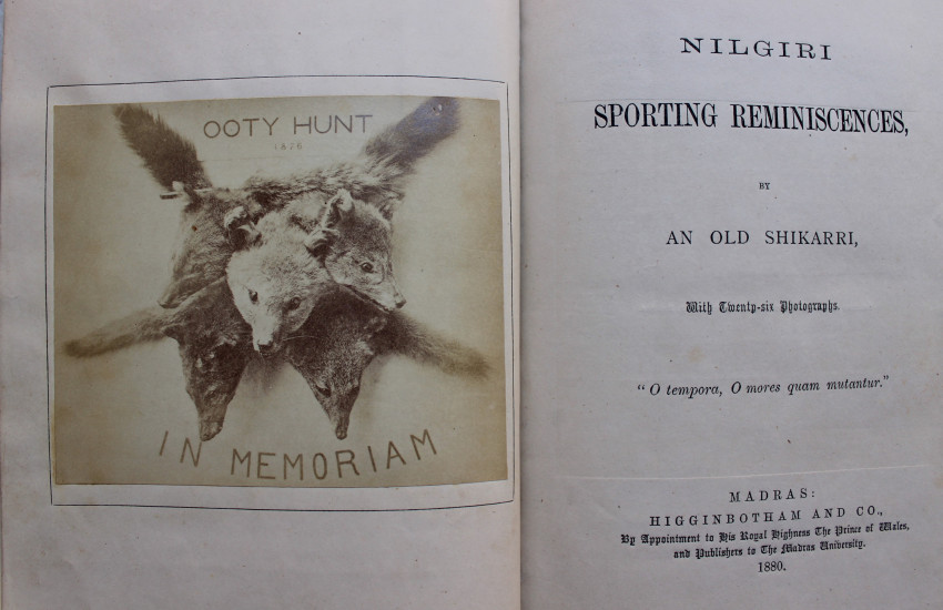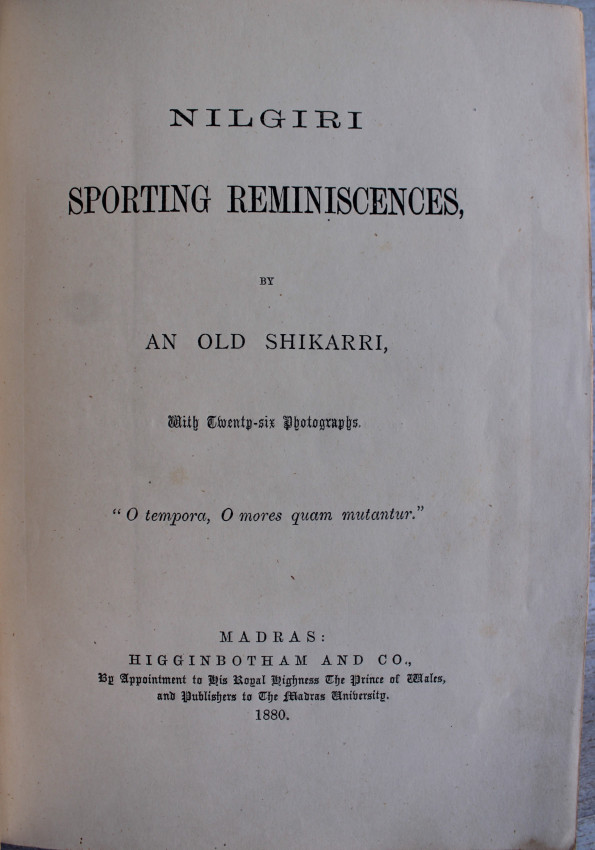 An excellent work describing hunting in the Nigrini Hills of southern India, featuring chapters on stalking ibex, sambur, and sported deer, with additional accounts of encounters with tigers and leopards. Of further interest are several descriptions of hunting, or temporarily mad elephants by other sportsmen, and stalking bison in the Bowany Valley. He also makes the claim that the works of Walter Campbell and the Old Shekarry (Henry Leveson) were "touched up with the colour of romance and 'sensation,' partaking largely of the hyperhole of shikar." (An Annotated Bibliography of Asian Big Game Hunting Books 1780 - 1980 - Czech)