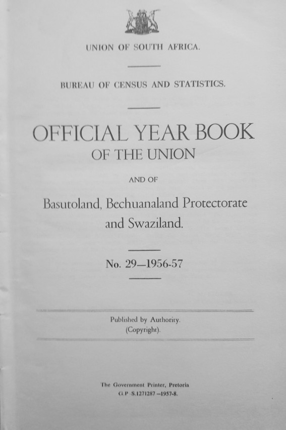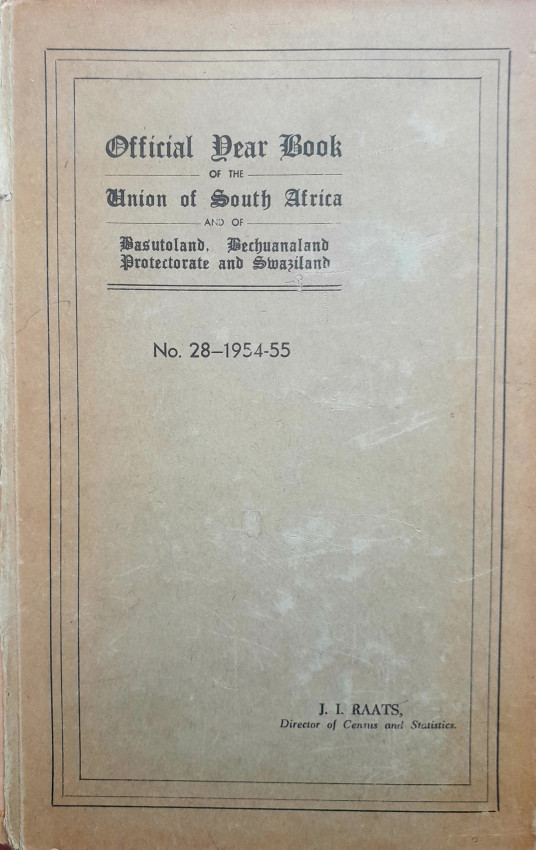 Official Year Book of the Union of South Africa and of Basutoland, Bechuanaland Protectorate and Swaziland for the years 1954-55 and 1956-57. Hard covers, 866 + 981 pages. Discoloration and wear to boards with tears at the spine areas, else good.