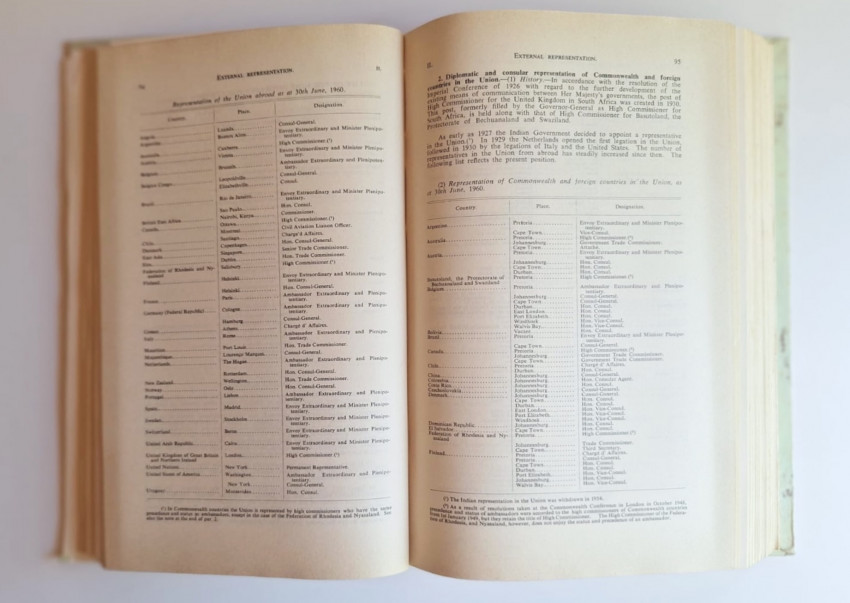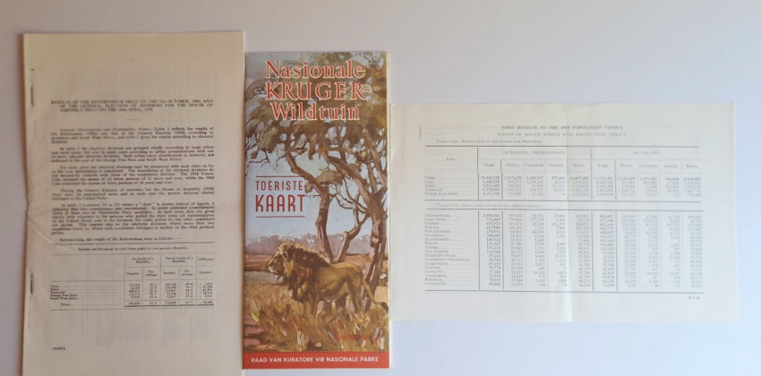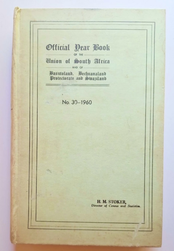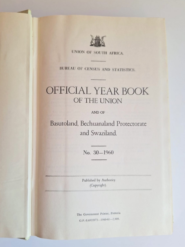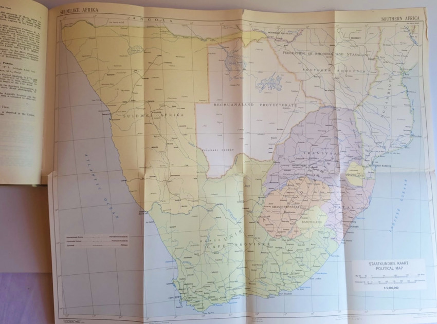 684pp, index 28pp with 3 colour fold out maps and a tourist map of Kruger National Park in a sleeve inside back cover. Includes two loose leaf inserts; results of 1960 referendum and preliminary results of 1960 population census.