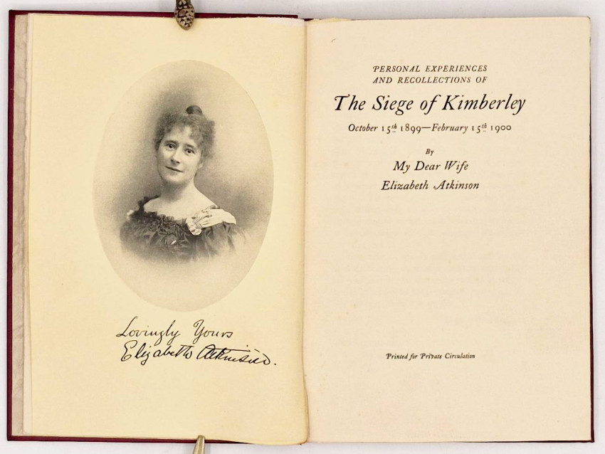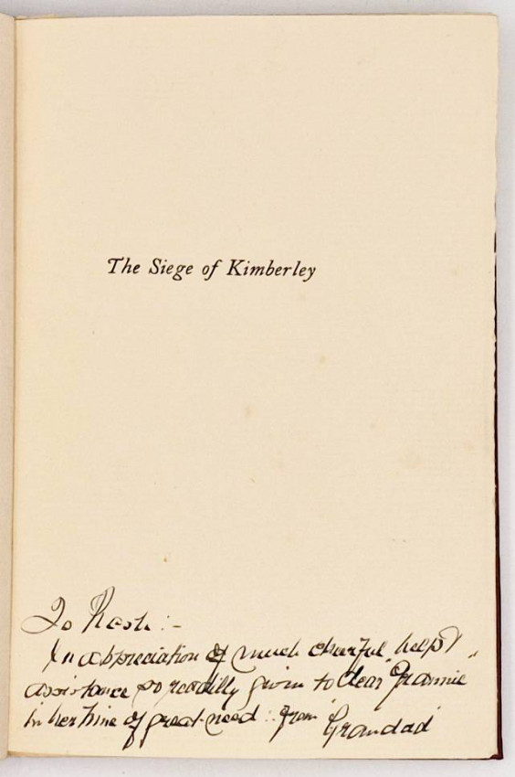 The account written is in the form of a continuous letter to ‘My own darling mother and all’. Her husband Willie appears to have been an engineer possibly in the employ of De Beers who became a member of the Town Guard. She was a school teacher and describes her efforts to both protect the children and maintain a program of lesson with all the male teachers being occupied in the Town Guard. She describes life in the town and the anticipation of early relief but gradually this anticipation wanes as new filters through of the various battles such as Belmont and Modder River. On a visit to the De Beers workshop and she sees the gun, Long Cecil, which had been manufactured by Mr Labrum, the chief engineer of the company who was later to be killed by a Boer shell. She describes the conditions under which 1400 people sheltered in De Beers mine, ‘Can you imagine the scene, for it is impossible to describe it? The people lining these tunnels, with little children, bundles, and no – or very little – light.’