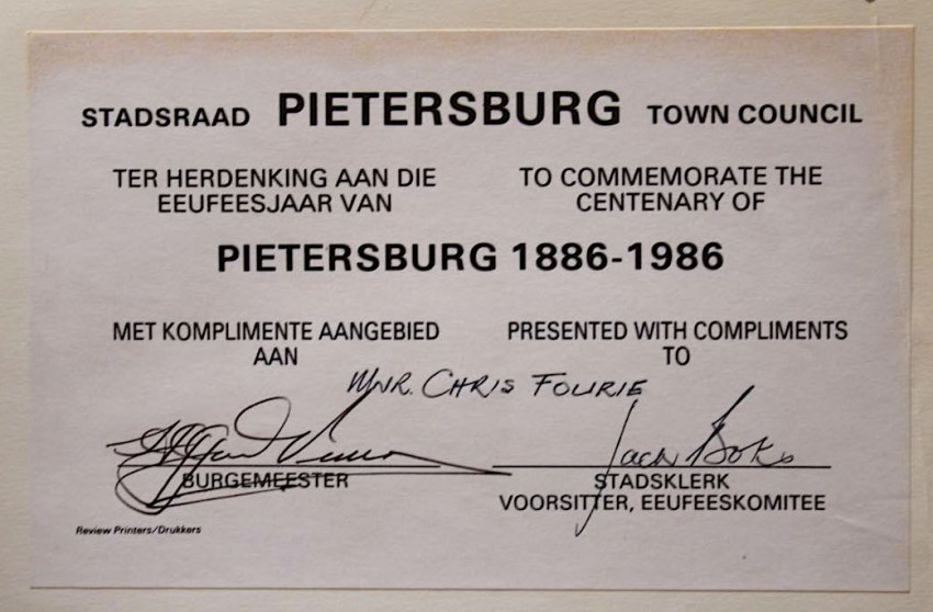 PIETERSBURG 1886-1986 - Signed by the Mayor & City Clerk of Pietersburg