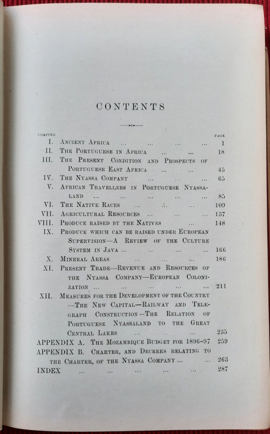 The acount on Portuguesse Nyassalynd and The Nyassa Chartered Company (Companhia Do Nyassa), with 12 full-page photographic plates (including frontispiece), 12 in-text sketches and 2 large multiple folding maps. The photographs, which are here reproduced, have been provided by the Nyassa Company.