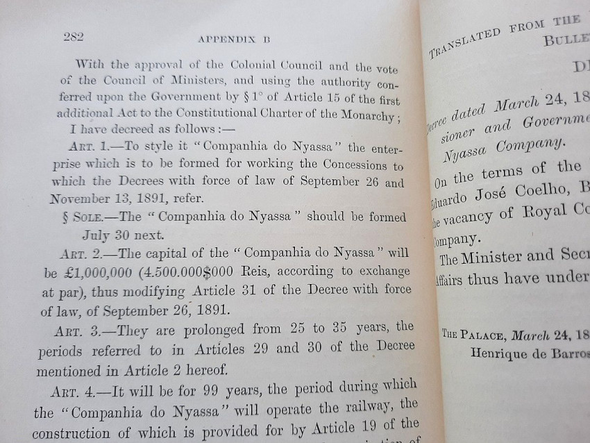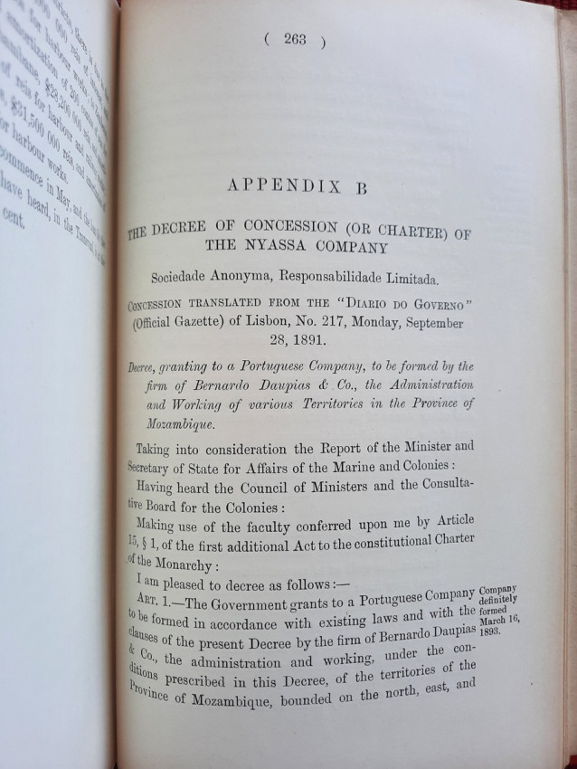 2) Appendix B: with "The Decree of Concession (or Charter) of the Nyassa Company" (Decree, granting to a Portuguese Company, to be formed by the firm of Bernardo Daupias & Co., the Administration and Working of various Territories in the Province of Mozambique, with all associated articles);"Royal Decrees"; "Decrees"; "Town of Ibo", etc.