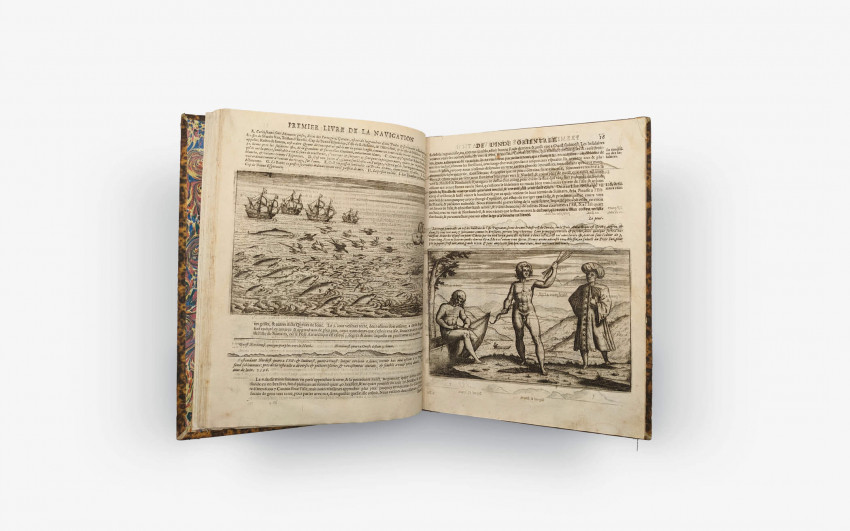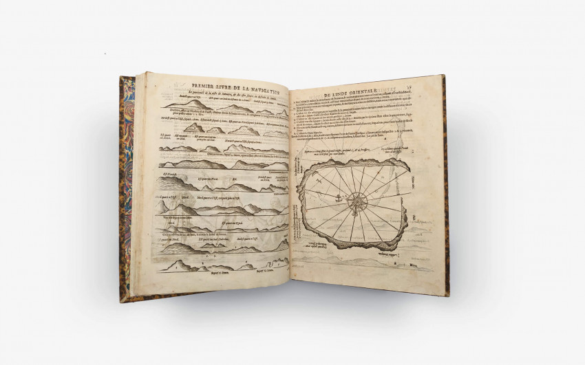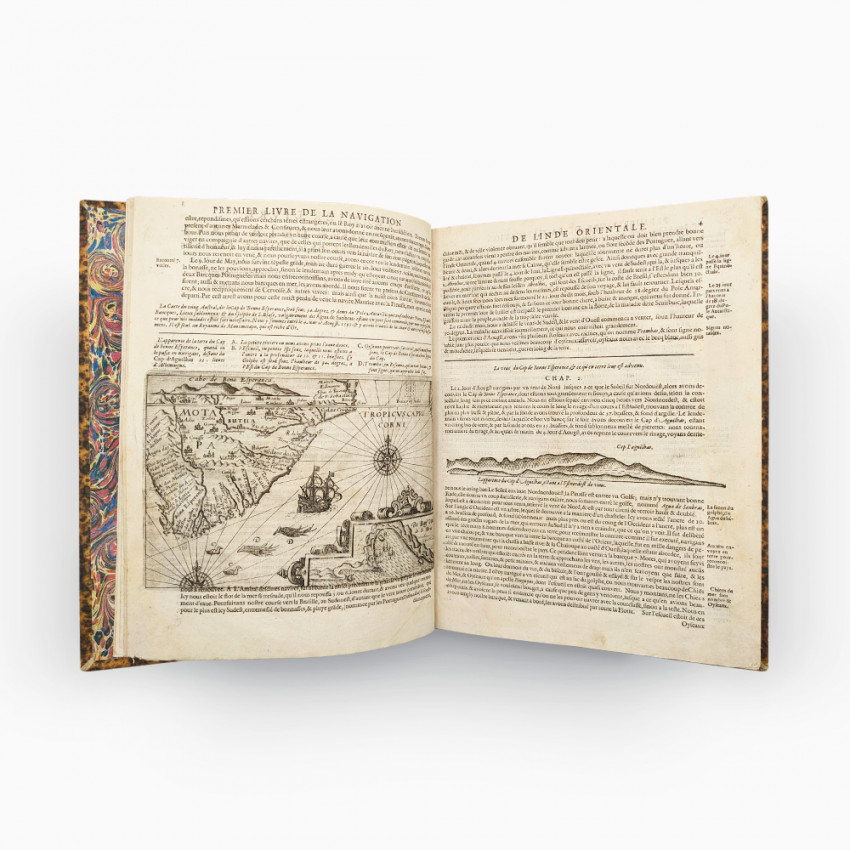 Lodewijcksz - Premier Livre de L'histoire de la Navigation aux Indes Orientales par les Hollandois, et des choses a eux advenues ensembles les conditions, les meurs, et manieres de vivre des nations, par eux abordees. Pkus les Monnoyes, Espices, Drogues, & marchandises, & le pris d’icelles. Davantage les de couvremens & apparences, situations, & costes maritimes des contrees, avec levray pourtraict au vif des habitations : Le tout par plusieurs figures illustré : tres recreatif a lire a tous navigans & amateurs des navigations lointaines, es terres estrangeres. G. M. A. VV. L.
