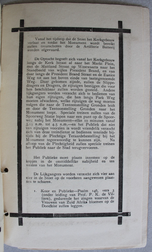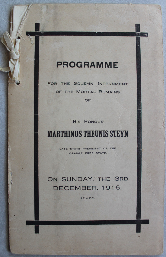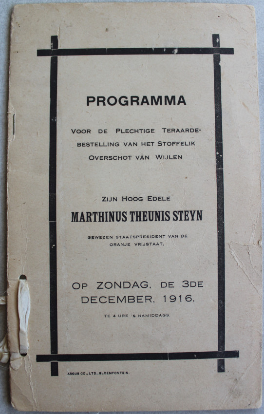 Programma voor de Plechtige Teraardebestelling van het stoffelik overschot van wijlen Zijn Hoog Edele Marthinus Theunis Steyn. Gewezen Staatspresident van de Oranje Vrijstaat. Op Zondag de 3de December, 1916.