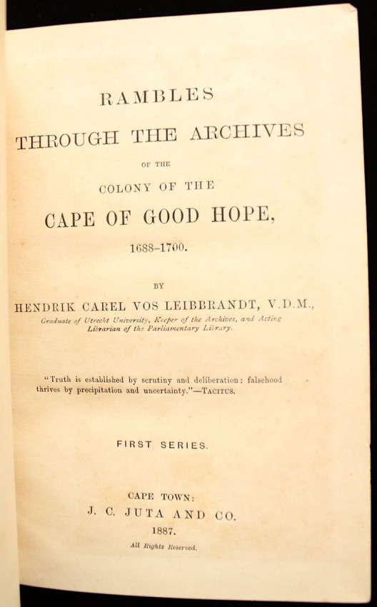 'In the first chapter of the work Mr. Liebbrandt observes that he "proposed to lay before the reader . . . some of the most remarkable events embraced within the administration of Governor Willem Adriaan van der Stel, a man hitherto considered as the embodiment of tyranny, cruelty, and oppression, because judged only from the description of his enemies, and without the light of evidence which places him in a more favourable view." A large part of the little volume is taken up by extracts from the Archives, showing how the difficulties which surrounded the Governor were the result of legacies from his predecessors. Considerable information is afforded respecting Simon van der Stel's tenure of office, and the early history of the Huguenots of the Colony, recording the suspicions attaching to them, and the determination of the authorities that they should be assimilated with the Dutch population of the Colony.' - Mendelssohn Vol.I, page 877