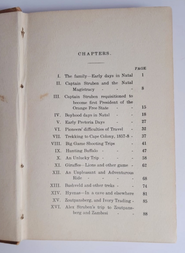 This rather scarce book is written by the early Johannesburg pioneer Harry Struben, and is edited by his daughter Edith. Chapters include: The family, Early days in Natal and Pretoria, Pioneers' difficulties of travel, Trekking to the Cape Colony, Big game shooting, Bushveld and other treks, Zoutpansberg, Ivory trading, Boer Voortrekkers and Commandos, Civil wars, British and European Pioneers and visitors to the Transvaal, Early farming ventures, Native wars and unrest, Discovery of diamond fields and early Kimberly days, Gold discoveries at Lydenberg and much more.