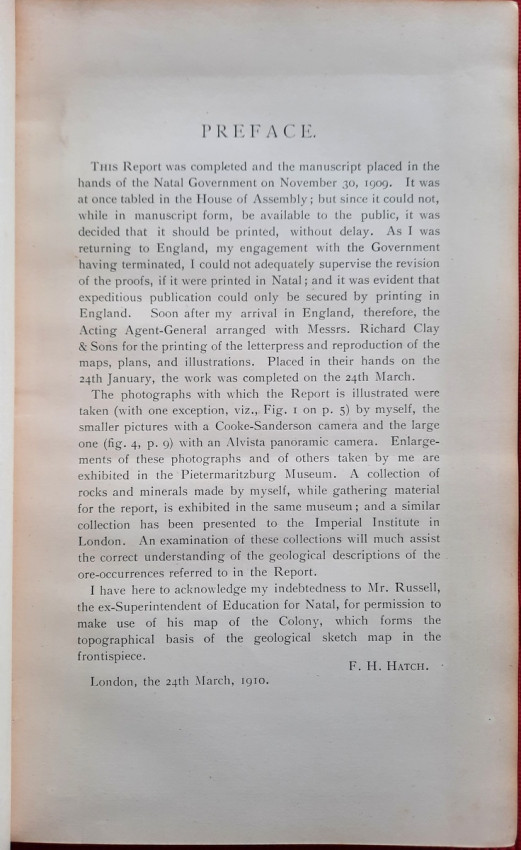 I have here to acknowledge my indebtedness to Mr. Russell, the ex-Superintendent of Education for Natal, for permission to make use of his map of the Colony, which forms the topographical basis of the geological sketch map in the frontispiece." (from the Author's "Preface")
