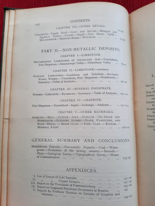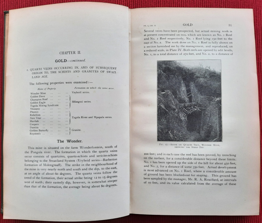 - Chapter II. which contains: Quartz Veins occurring in, and of subsequent origin to, the Schists and Granites of Swaziland Age; The Wonder. The Golden Dove; The Champion Reef; The Golden Eagle. Tugela Mining Syndicate; The Nkozana; The Phœnix; The Rebellion; The New Year. The Havilah; Cooper's; The Dumisa. The Golden Butterfly; Royston's; Summary).