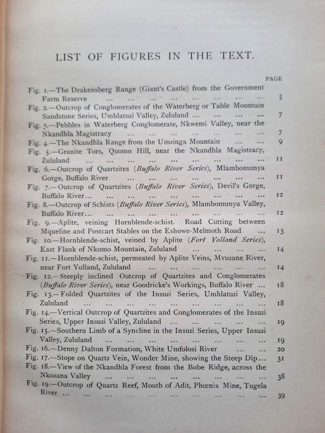 "The photographs with which the Report is illustrated were taken (with one exception, viz., Fig. I on p. 5) by myself, the smaller pictures with a Cooke-Sanderson camera and the large one (fig. 4, p. 9) with an Alvista panoramic camera. Enlargements of these photographs and of others taken by me are exhibited in the Pietermaritzburg Museum. A collection of rocks and minerals made by myself, while gathering material for the report, is exhibited in the same museum; and a similar collection has been presented to the Imperial Institute in London. An examination of these collections will much assist the correct understanding of the geological descriptions of the ore-occurrences referred to in the Report.