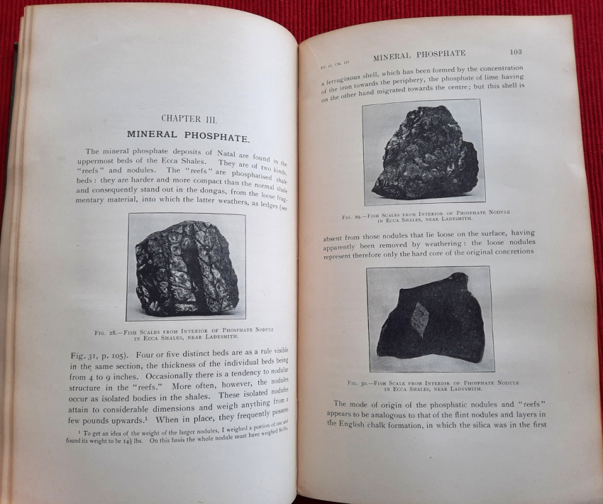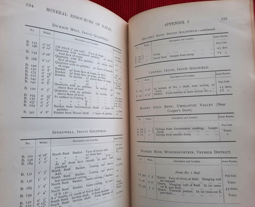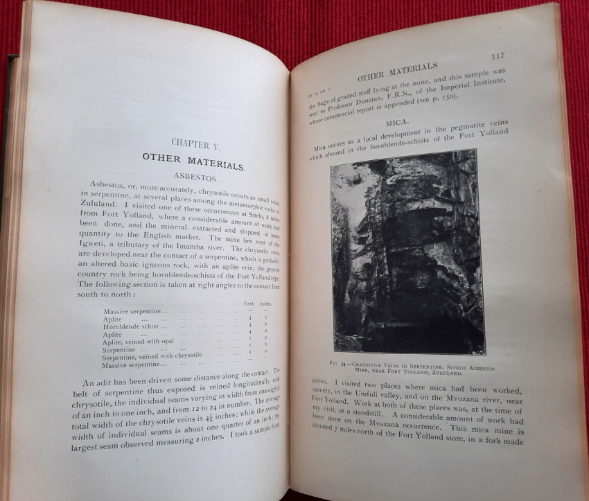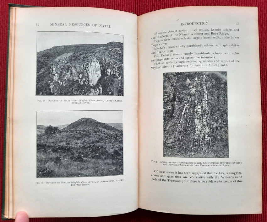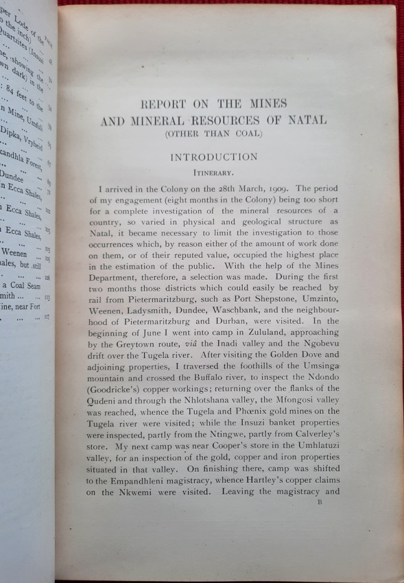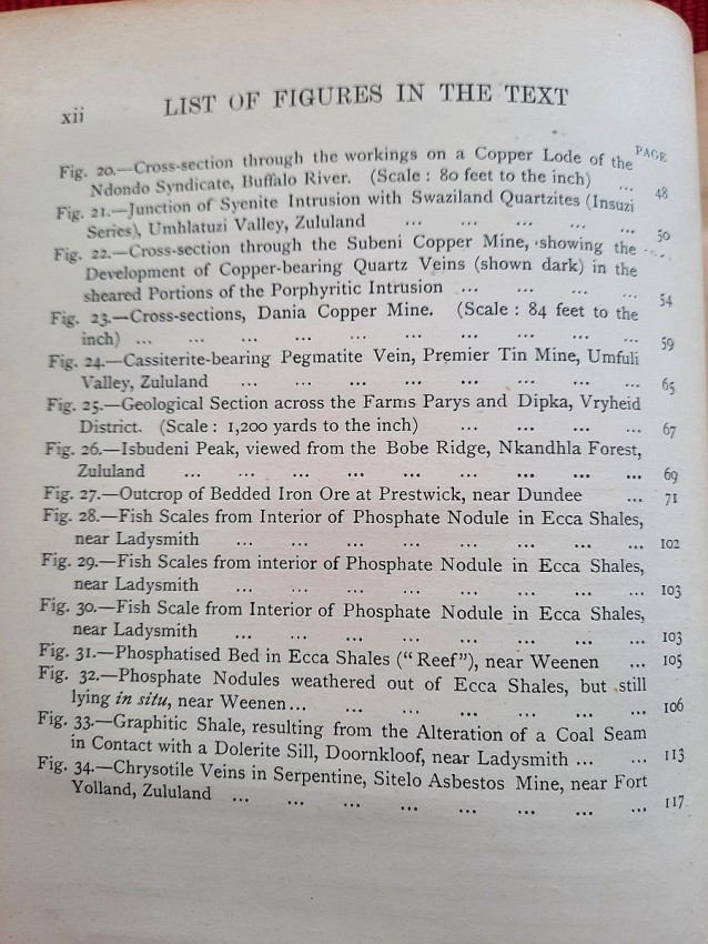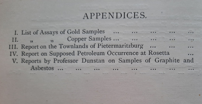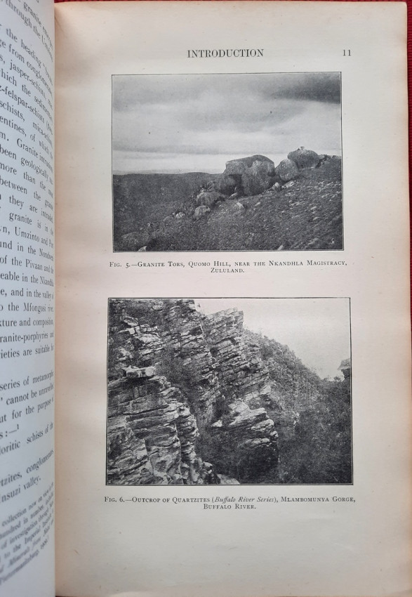 "The photographs with which the Report is illustrated were taken (with one exception, viz., Fig. I on p. 5) by myself, the smaller pictures with a Cooke-Sanderson camera and the large one (fig. 4, p. 9) with an Alvista panoramic camera. Enlargements of these photographs and of others taken by me are exhibited in the Pietermaritzburg Museum. A collection of rocks and minerals made by myself, while gathering material for the report, is exhibited in the same museum; and a similar collection has been presented to the Imperial Institute in London. An examination of these collections will much assist the correct understanding of the geological descriptions of the ore-occurrences referred to in the Report.