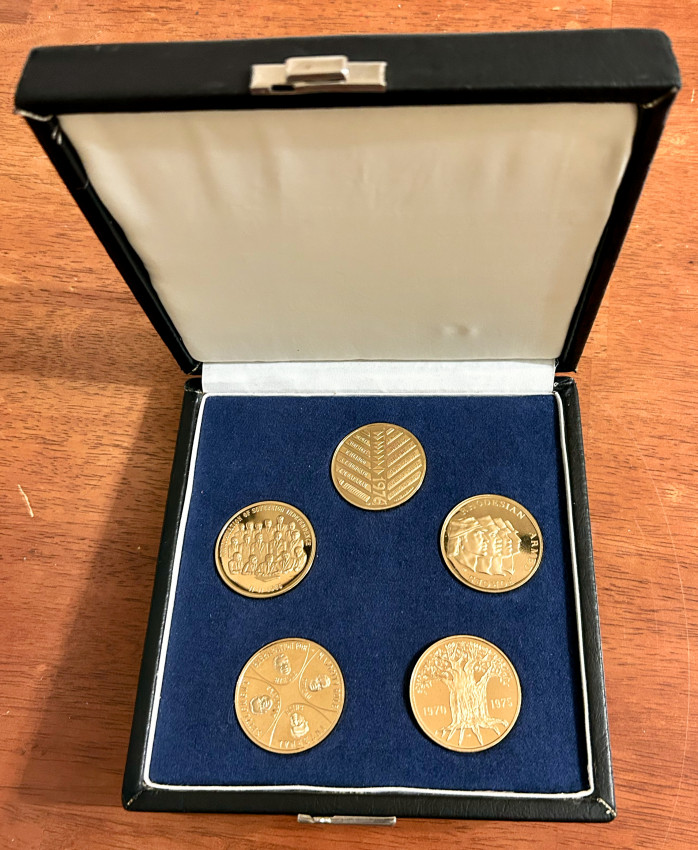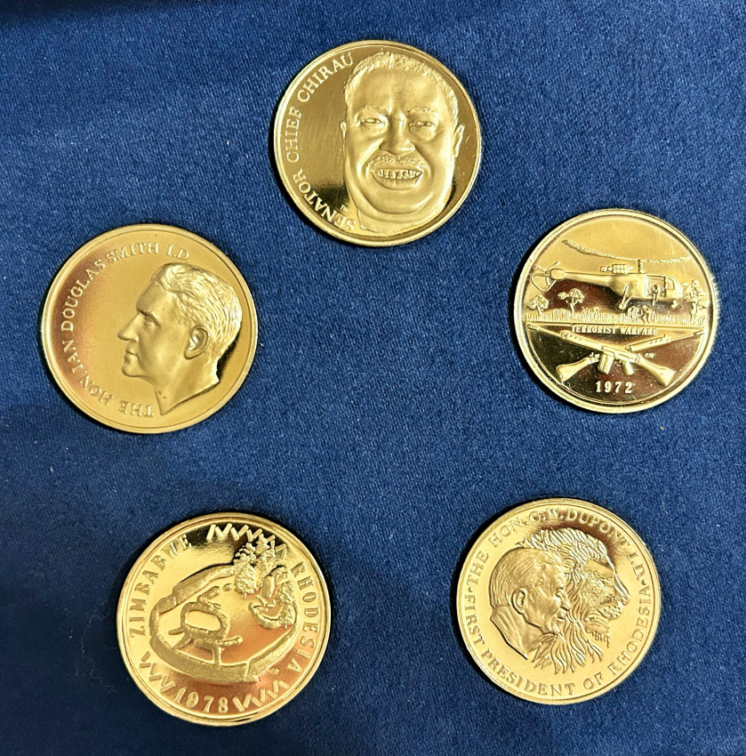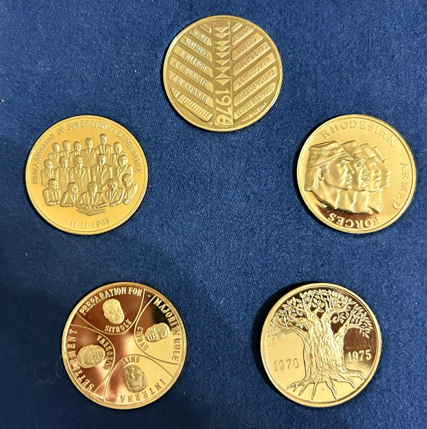 A collection of 5 burnished bronze medallions, each weighing 1 troy ounce, produced and issued by the Rhodesian Government to commemorate the political history of the country, which culminated in the so-called Internal Settlement of 1978 and the the first black majority rule elections in 1979.