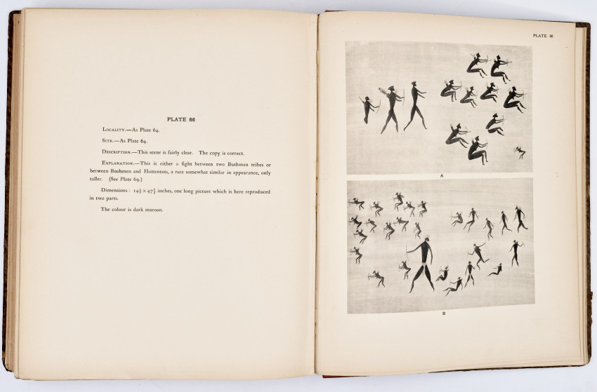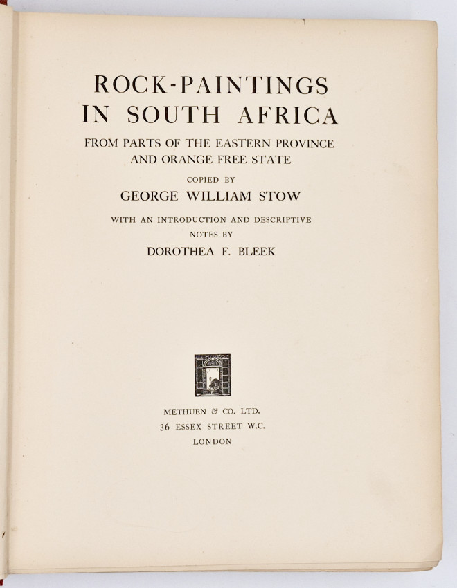 G.W. Stow, a geologist and ethnologist travelled extensively across the interior of South Africa (specifically the Eastern Province and Orange Free State) between 1867 and 1882. Stow was one of the first Europeans to recognize the artistic and cultural value of these paintings, fearing—correctly—that they would eventually be destroyed by weathering and vandalism. Stow copied these images by hand, and while his copies are stylized interpretations rather than exact photographic facsimiles, they remain an invaluable record of art that has since faded or vanished entirely. After Stow's death, his portfolio was purchased by Lucy Lloyd (Dorothea Bleek's aunt) and eventually published nearly 50 years later with Bleek's introduction and notes.