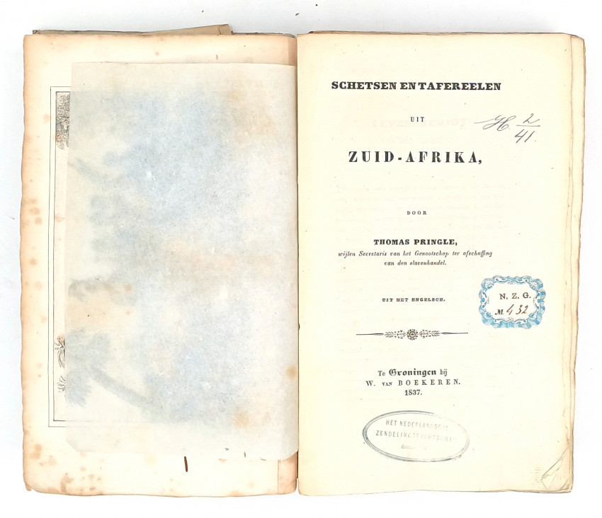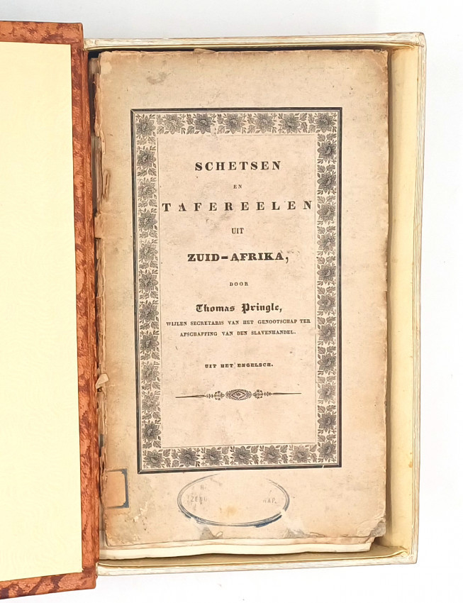 Mendelssohn (Sidney) South African Bibliography, volume 2, page 118, 'The Dutch edition of Scenes and Sketches in South Africa, by Thomas Pringle, sometime Secretary to the Anti-Slavery Society. Containing a biography, and a frontispiece.'