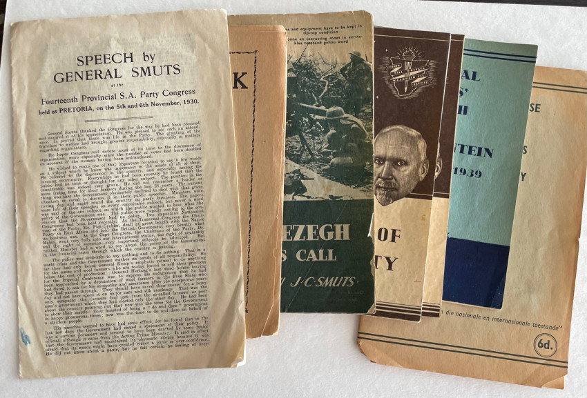 1. SPEECH Delivered by GENERAL J. C. SMUTS At the Special Congress of the South African Party held at Bloemfontein on Wednesday, October 27th, 1920. 20pp. very fragile pamphlet with the Afrikaans version on the rear 10pp.(TOESPRAAK Gehouden door GENERAAL J.C.SMUTS.........). Very fragile frayed pamphlet with marked browned tape repairs on the front and rear covers. Signature of C.A.P. Viljoen, journalist and friend of Smuts, on both the front and the rear covers. (see images). SABIB Vol 5, pp.231. Only one copy identified.