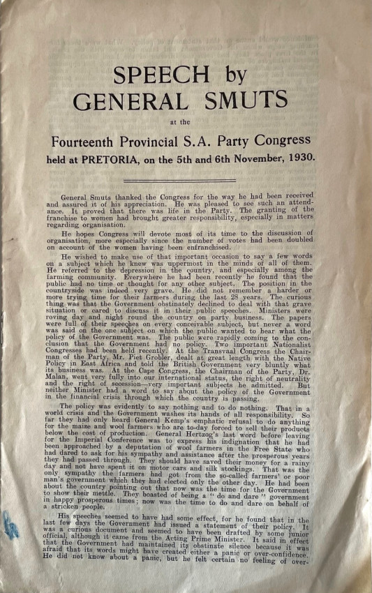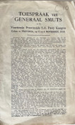2. SPEECH by GENERAL SMUTS at the Fourteenth Provincial S.A. Party Congress held at Pretoria, on the 5th and 6th November, 1930. 2 folded stapled leaves - 8pp. with the Afrikaans version (GENERAAL SMUTS SE TOESPRAAK ........) on the rear 4 pages. A good copy of this fragile item. Does not appear to be in SABIB.