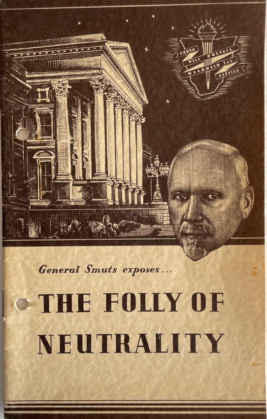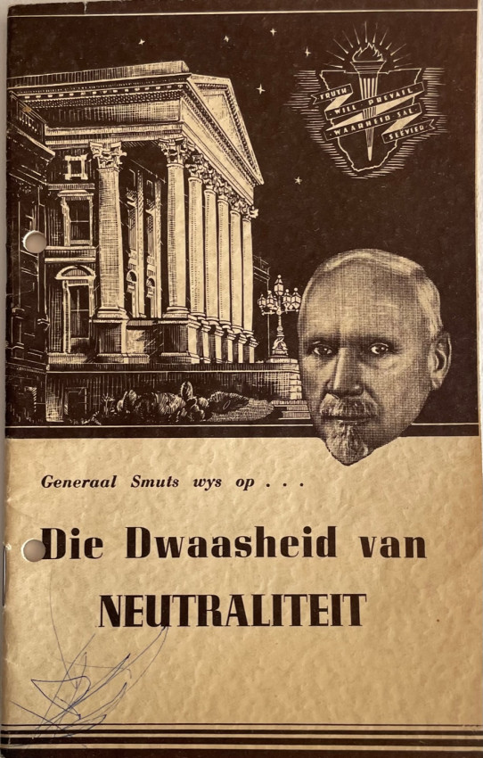 5. Generaal Smuts wys op DIE DWAASHEID VAN NEUTRALITEIT. 1939. The Afrikaans version of Item 4 and a lookalike. 32pp. in wraps. Filing holes otherwise a very good copy.