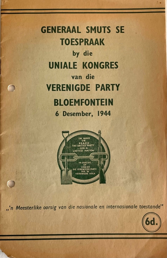 7. Generaal Smuts se Toespraak by die Uniale Kongres van die Verenigde Party - Bloemfontein, 6 Desember, 1944. 18pp. pamphlet in integral printed wraps. Lower corners chipped and filing holes not affecting the text, otherwise a very good copy of this fragile item.