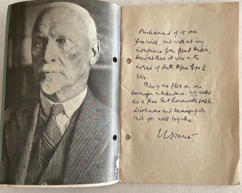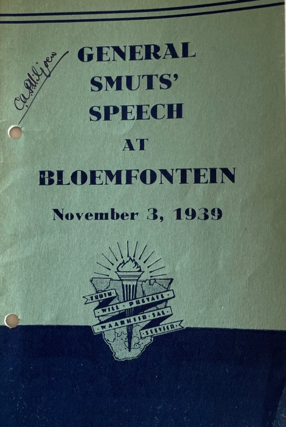 3. General Smuts Speech at Bloemfontein November 3, 1939. Why The Union is at War with Nazi Germany. 32pp. pamphlet in the original blue wraps. With frontispiece portrait of Smuts and a photocopy of a Smuts handwritten sentiment. Filing holes not affecting the text otherwise a very good copy.