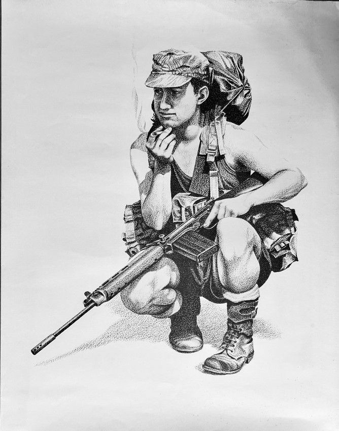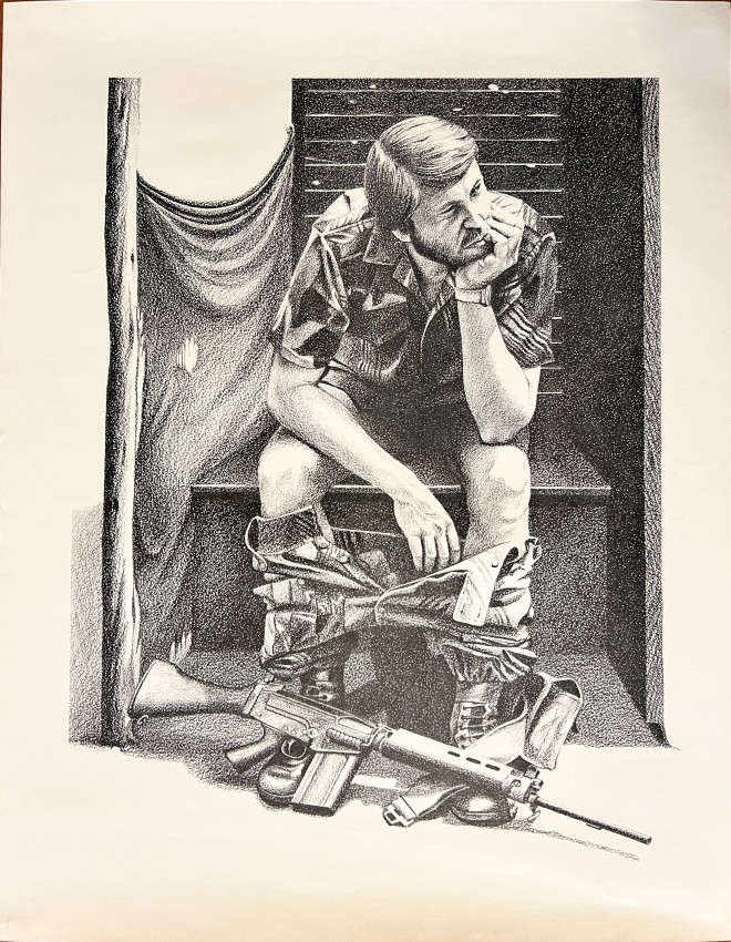 Depicts Rhodesian civilians and soldiers as observed by him the artist.