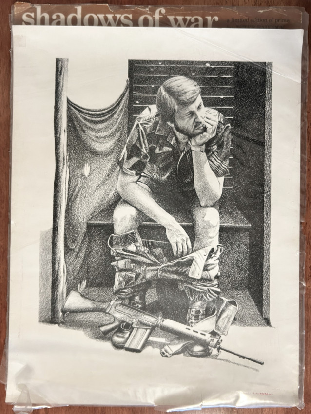 Seven prints from the 'Shadows of War' series by Peter Badcock (1949-2025).