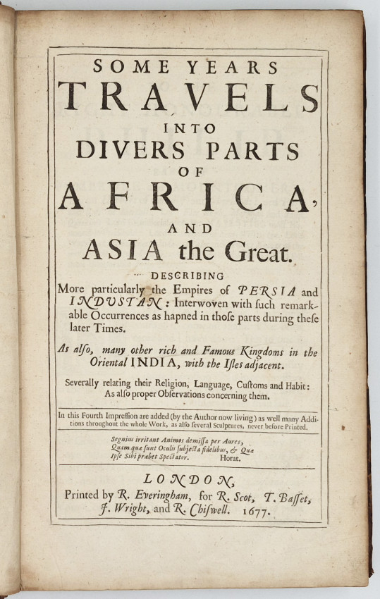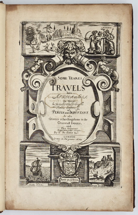 'Herbert and the remaining English returned through India and again around the Cape. After his return, while waiting to assume his position at court Herbert wrote the first version of his travel narrative, A Description of the Persian Monarchy now beinge: the Orientall Indyes, lies and other parts of the greater Asia and Africk (1634). The book was an impressive folio with an engraved title page and thirty-five copperplate engravings and maps. Herbert continued to work on the book, producing an enlarged edition entitled Some Yeares Travels into Divers Parts of Asia and Afrique in 1638. A third revision that included still more, largely historical material, had three printings in 1664, 1665, and 1677. The 1665 edition is noteworthy for the inclusion of an engraving of Persepolis by Wenceslas Hollar, commissioned by Herbert.’