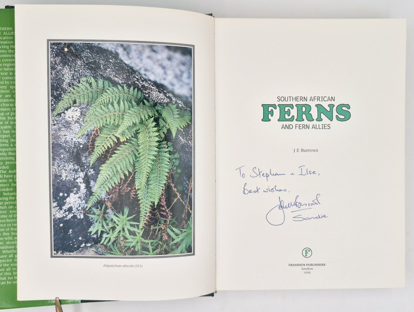 'Southern African Ferns and Fern Allies by J E Burrows represents the culmination of eighteen years of fern collecting throughout southern Africa and into the remotest corners of this subcontinent. It is a comprehensive work covering all 343 known species of the region and including also some of the naturalised introduced species. Every species is illustrated with excellent colour photography and there are over 800 individual line illustrations, showing salient diagnostic characteristics and providing extensive insight into this fascinating group of plants.' Editor's note.